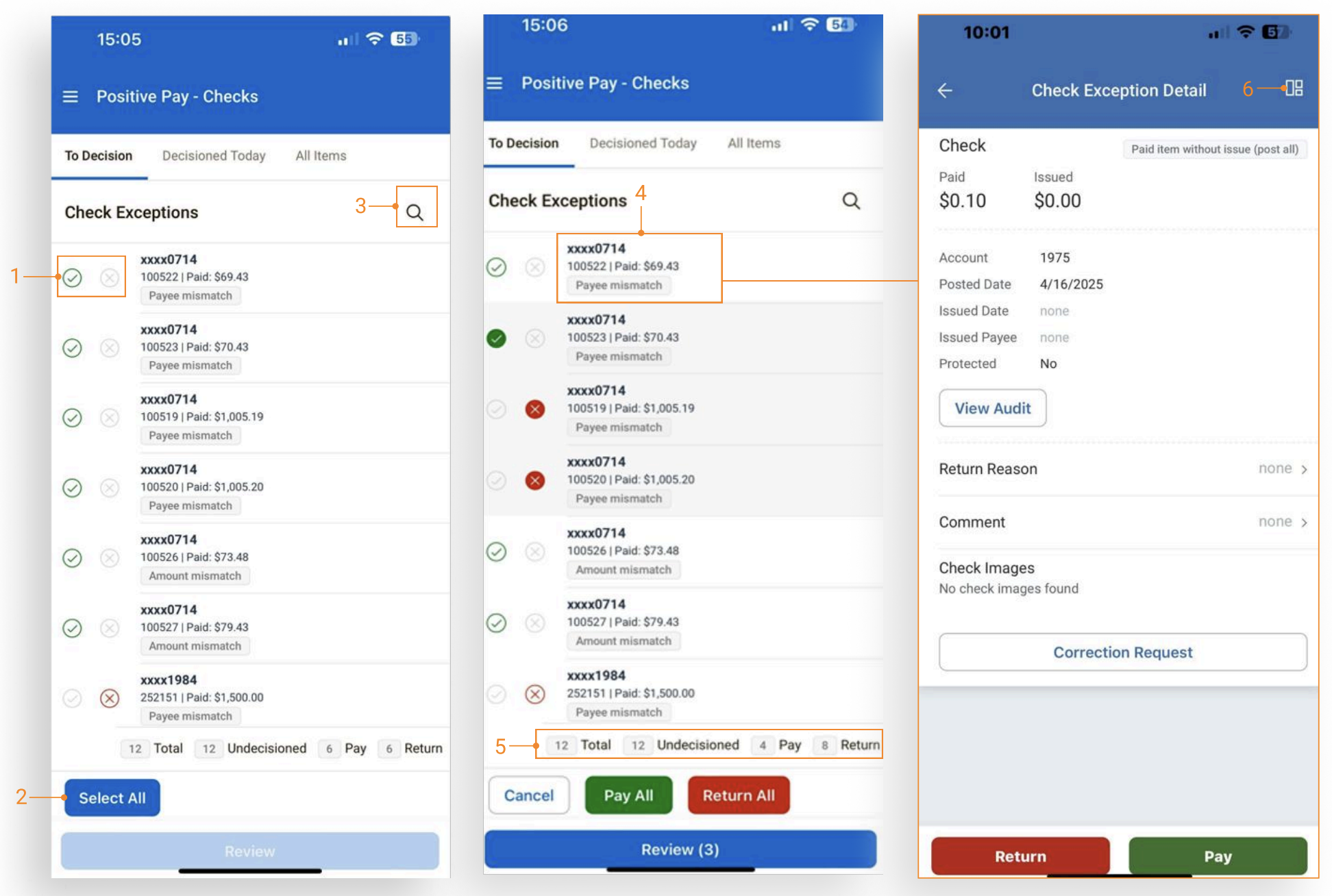 - Tap the Return or Pay button to decision the item from the detail view.