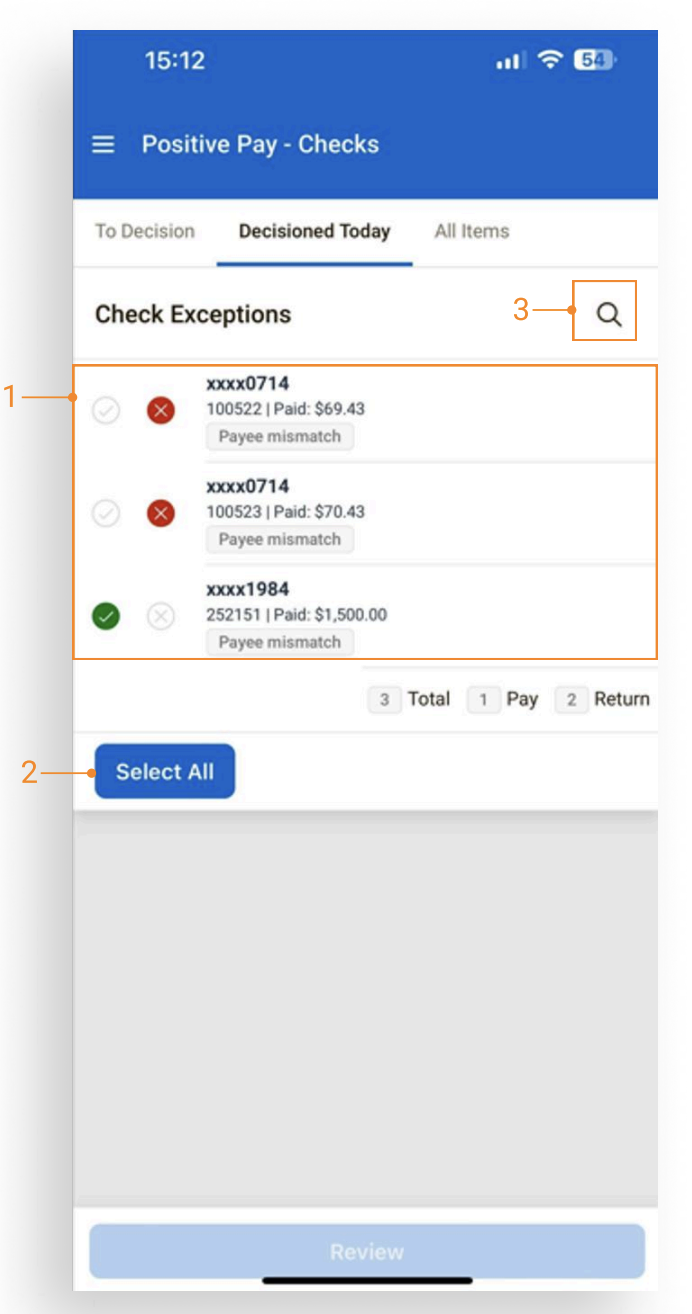 Decisioned Today: Check exceptions under the “Decisioned Today” view are items that were previously decisioned or items that the bank has decisioned and protected. Items decisioned by a company user display a solid-color radio button. If items are not decisioned by the user or the bank, the Decisioned Today view will not display any exceptions.