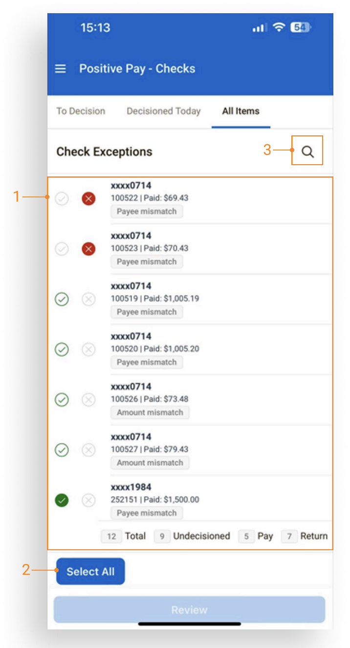 All Items: A comprehensive view that combines items To Decision and items Decisioned Today, including check exception items that have been worked and protected by the financial institution.