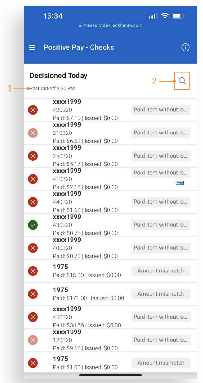 - After cutoff time, all items display on the Decisioned Today page in a read-only state. Items remain visible to the user until the completion of End of Day. After End of Day is complete, the exceptions displayed on the Decisioned Today will be available as history on the Check Exceptions - Decisioned Activity page on the desktop.