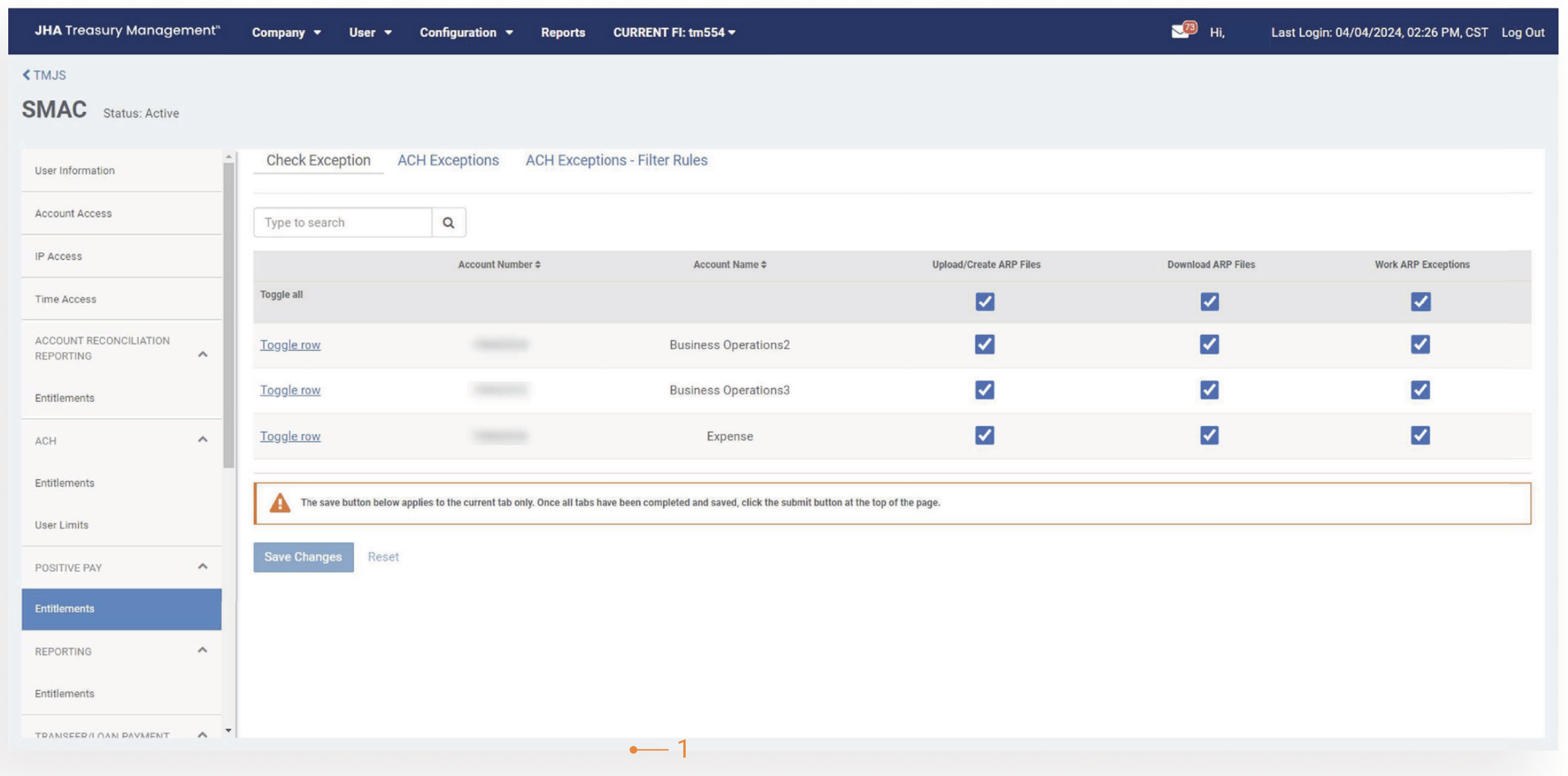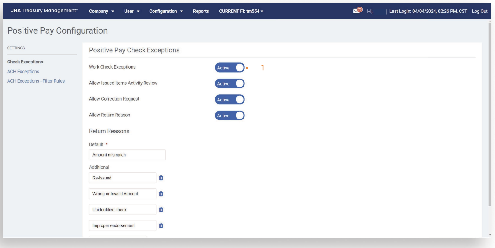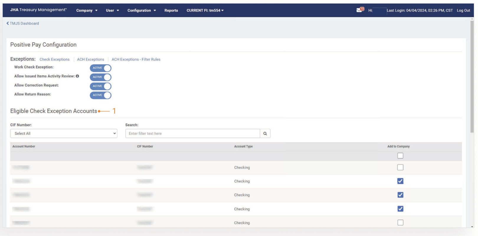 Once this confirguration is activated and at least one eligible account is selected, entitled customers can work check exceptions.