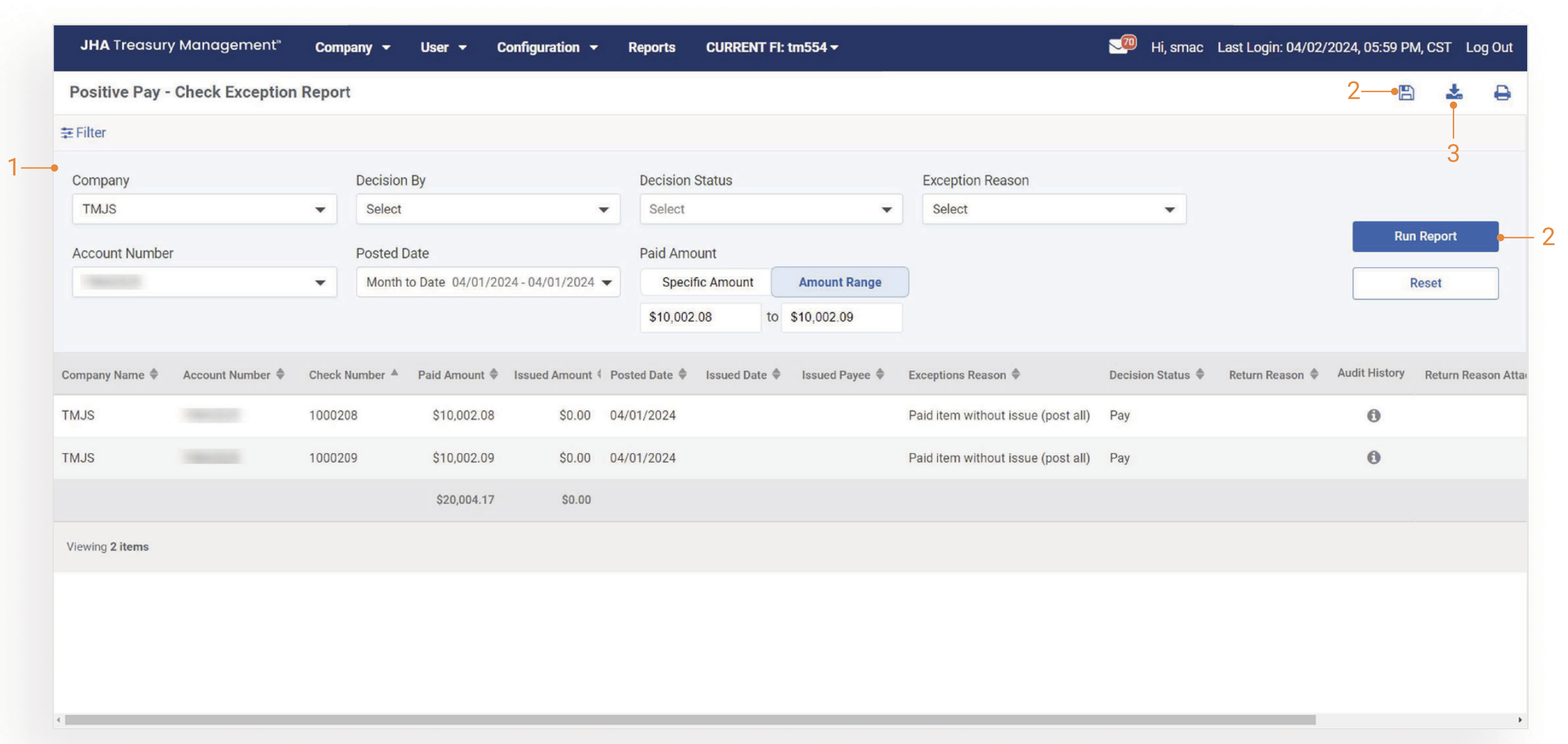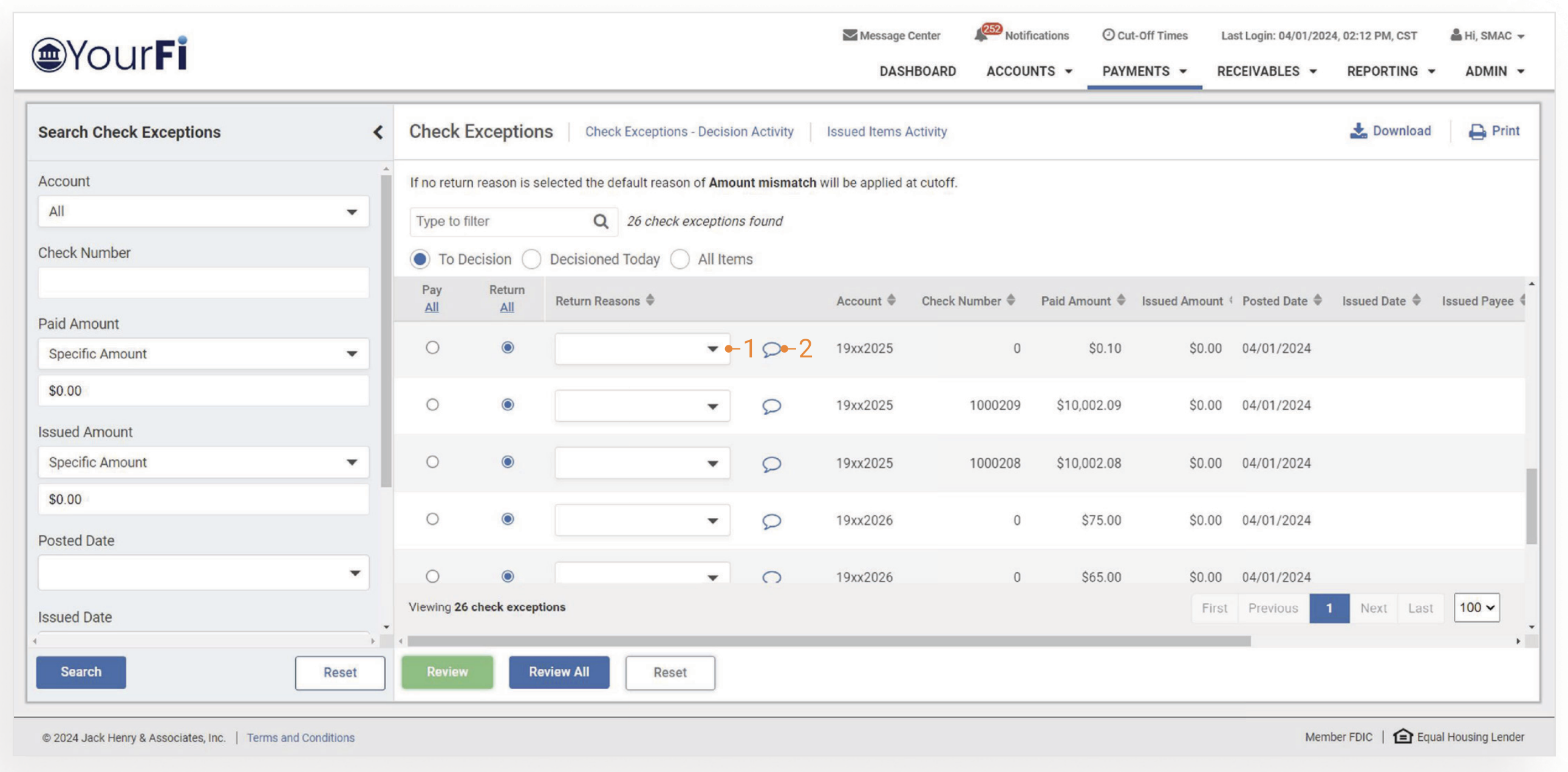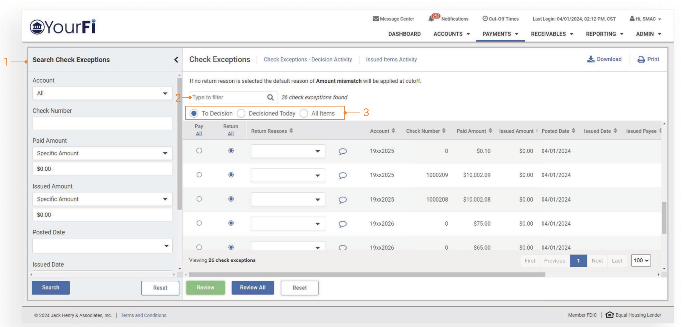- Positive Pay Check Exceptions Report – this report will provide a view of all exceptions presented, and will provide up to date tracking of exceptions decisioned along with an audit trail.