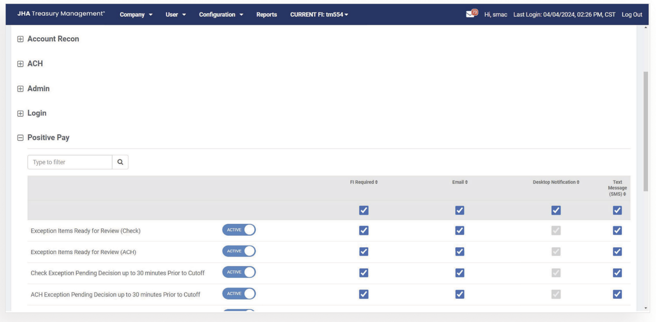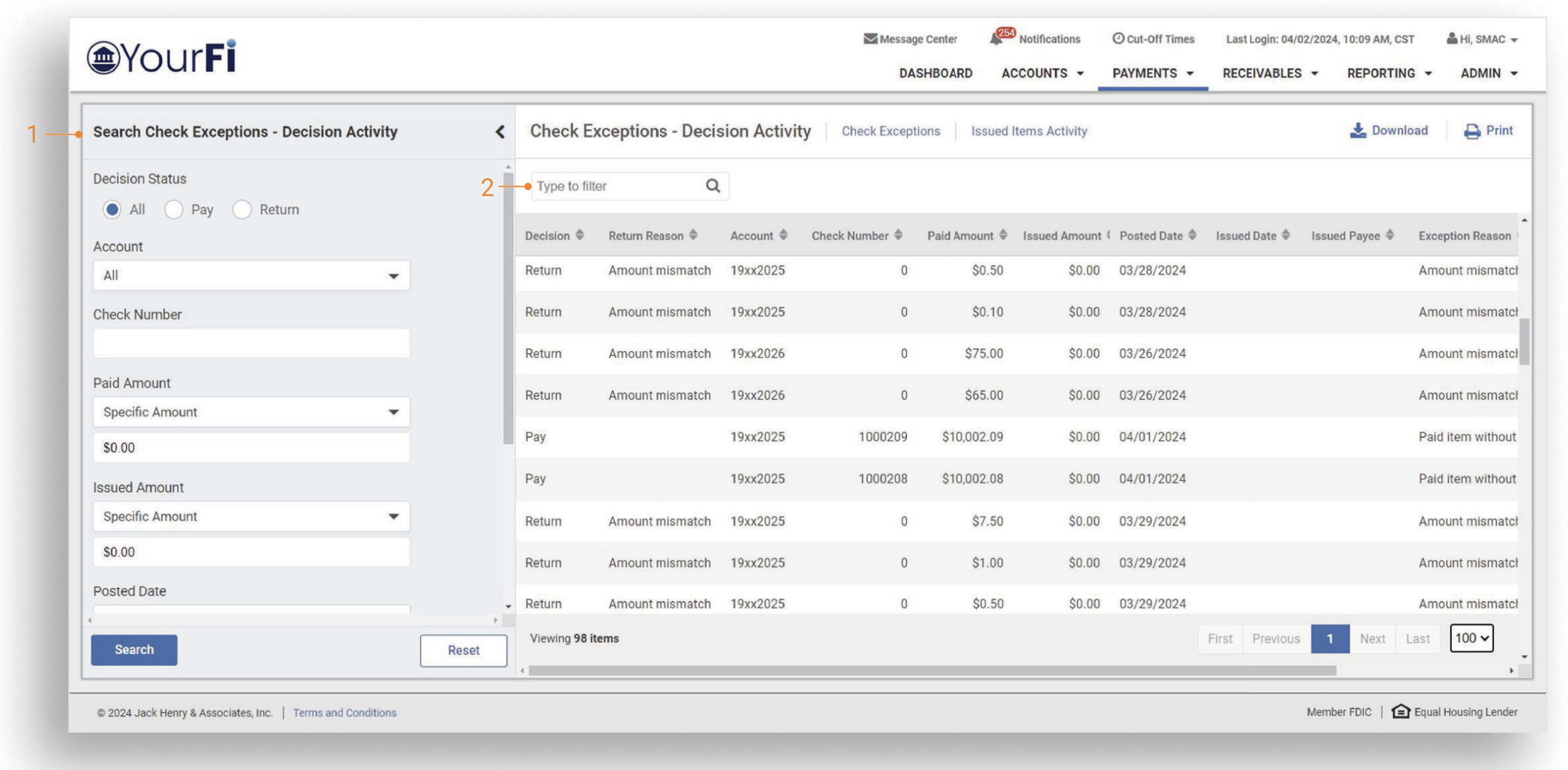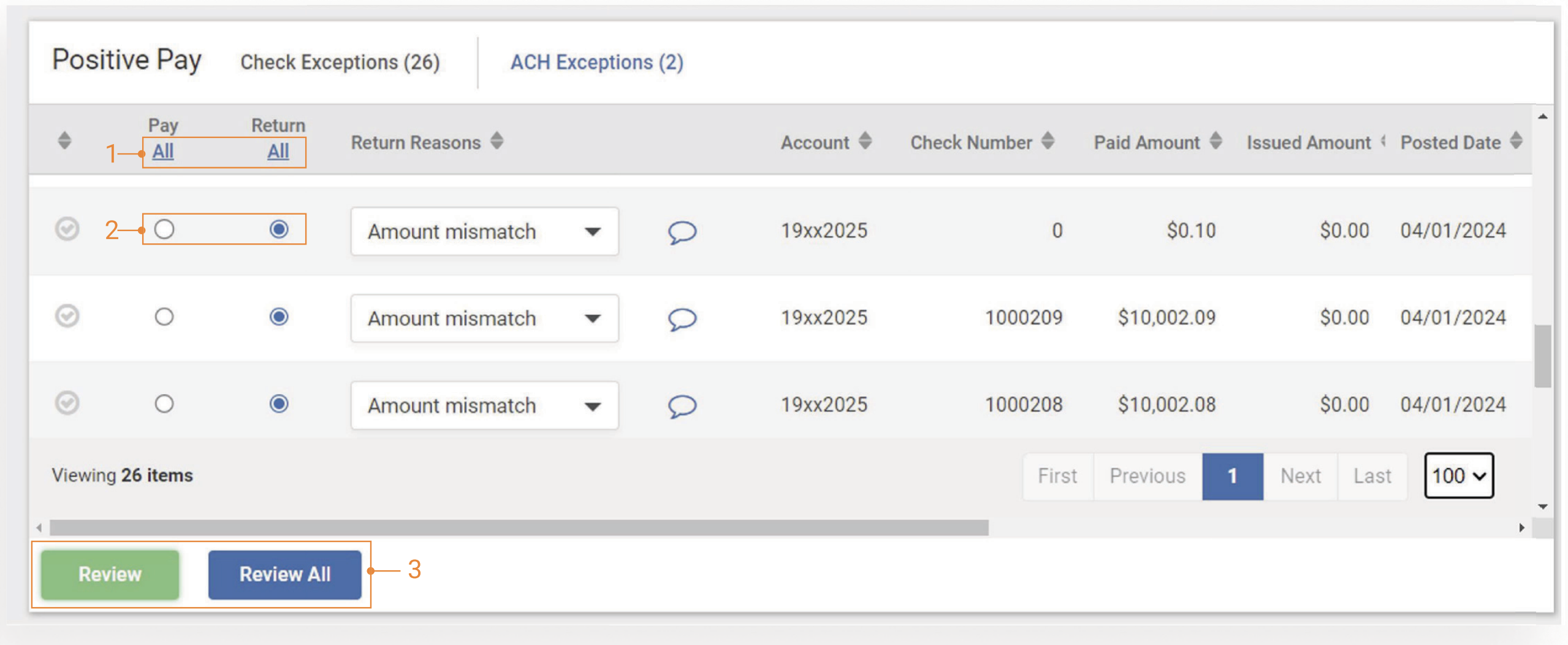 - Positive Pay Check Exceptions Report – this report will provide a view of all exceptions presented, and will provide up to date tracking of exceptions decisioned along with an audit trail.