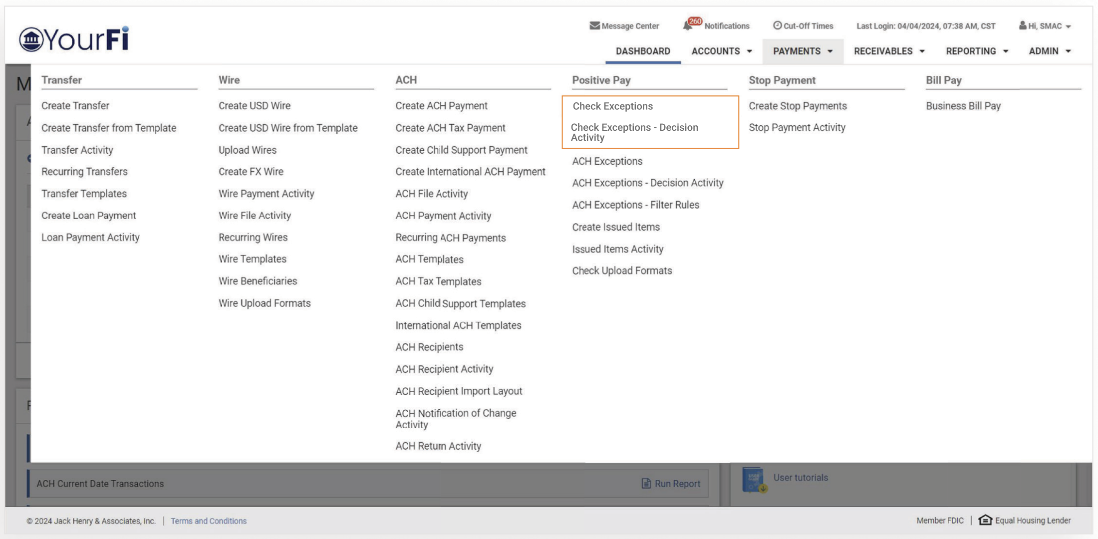 Once the appropriate user entitlements have been granted, the customer will see the following navigation: Payments > Positive Pay > Check Exceptions and Check Exceptions – Decision Activity.