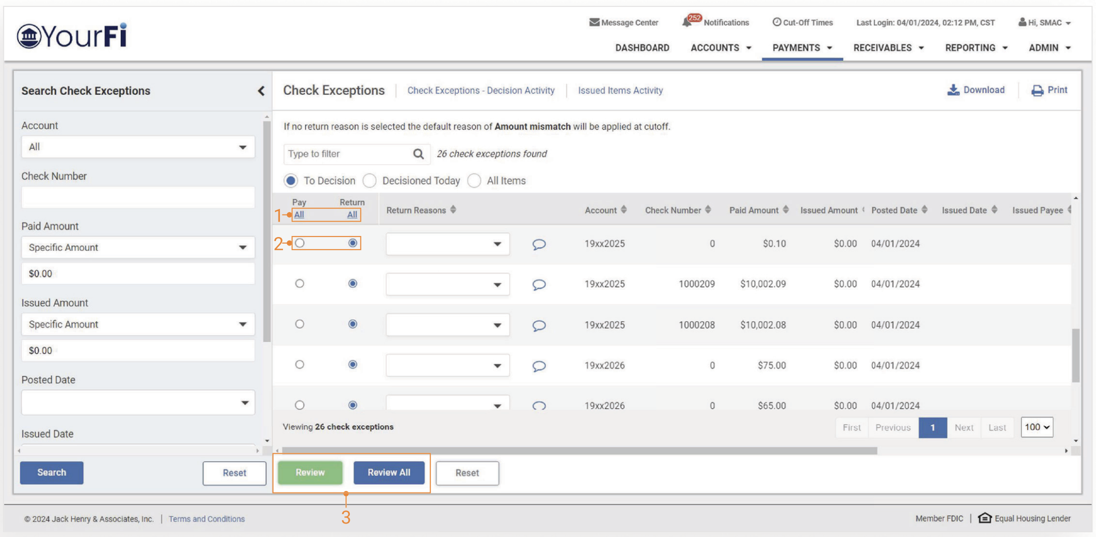 Users have the option to pay all exceptions or return all exceptions with the selection of the All hyperlink.