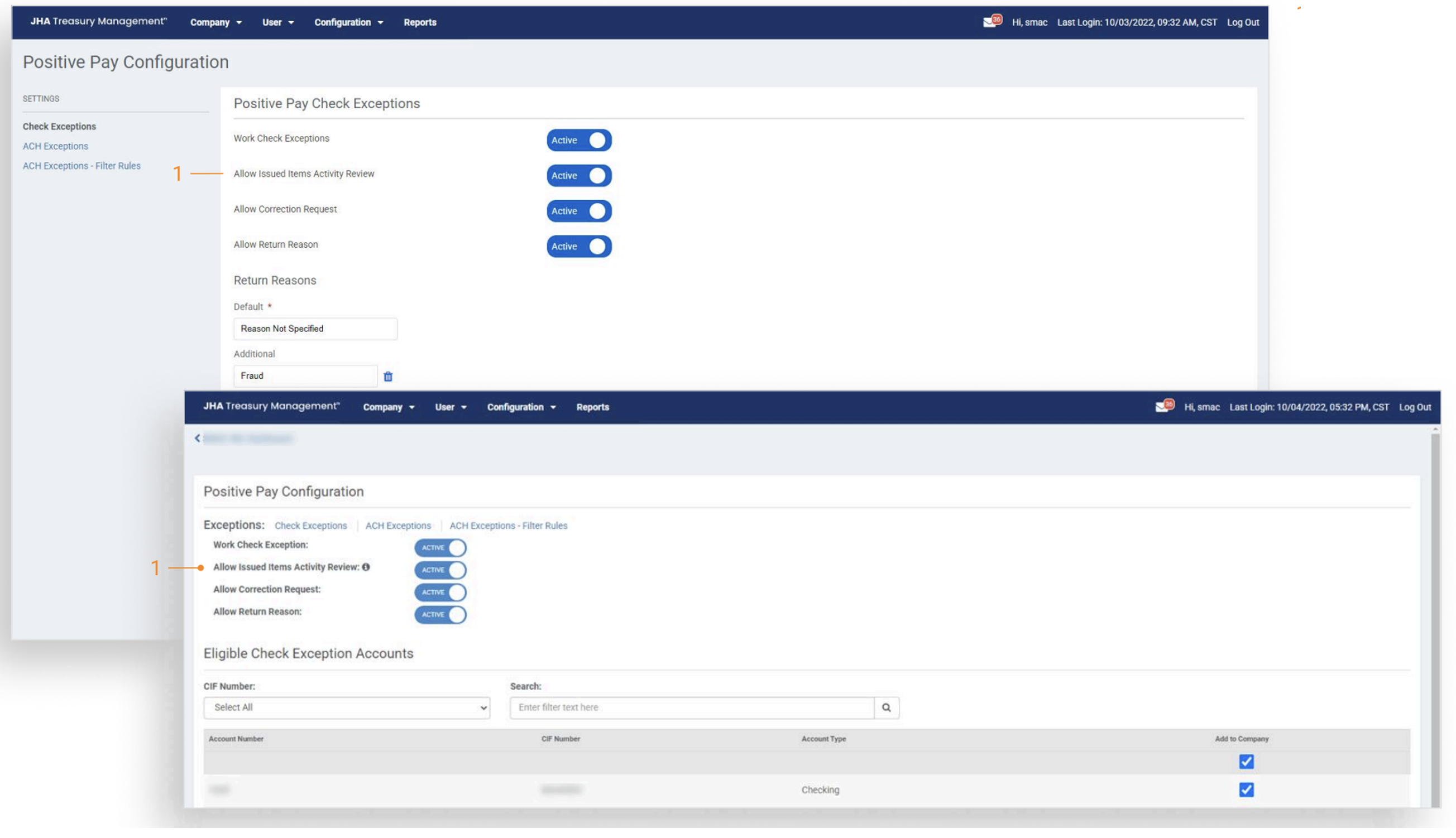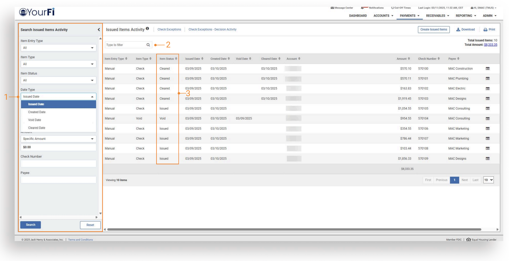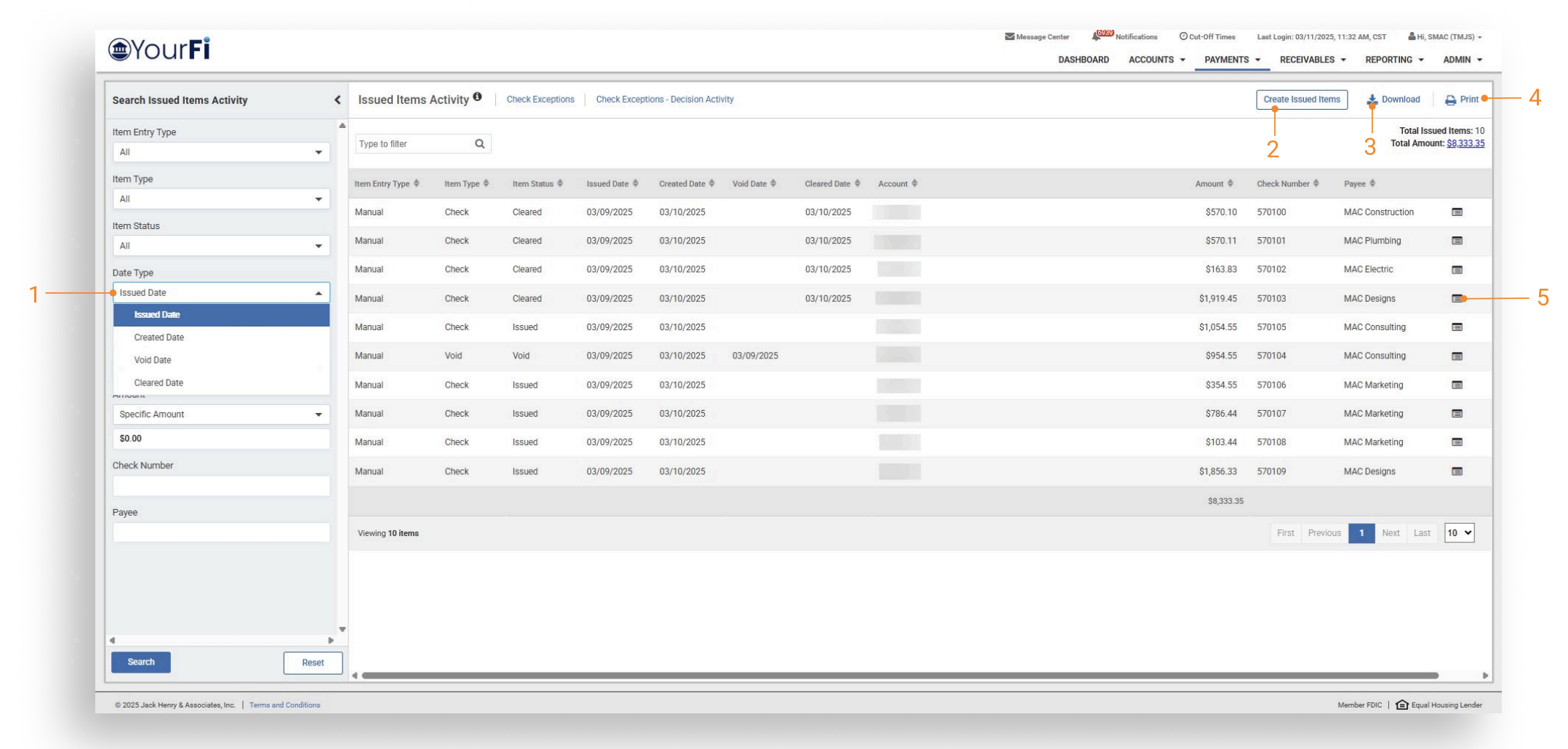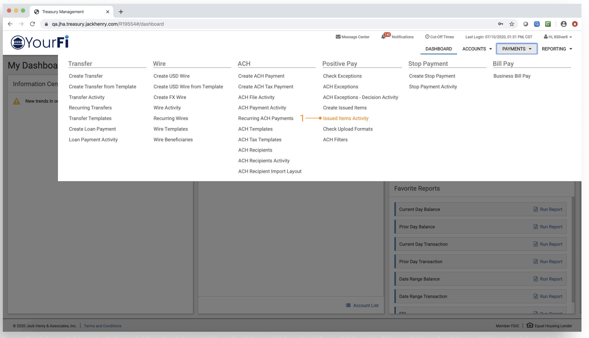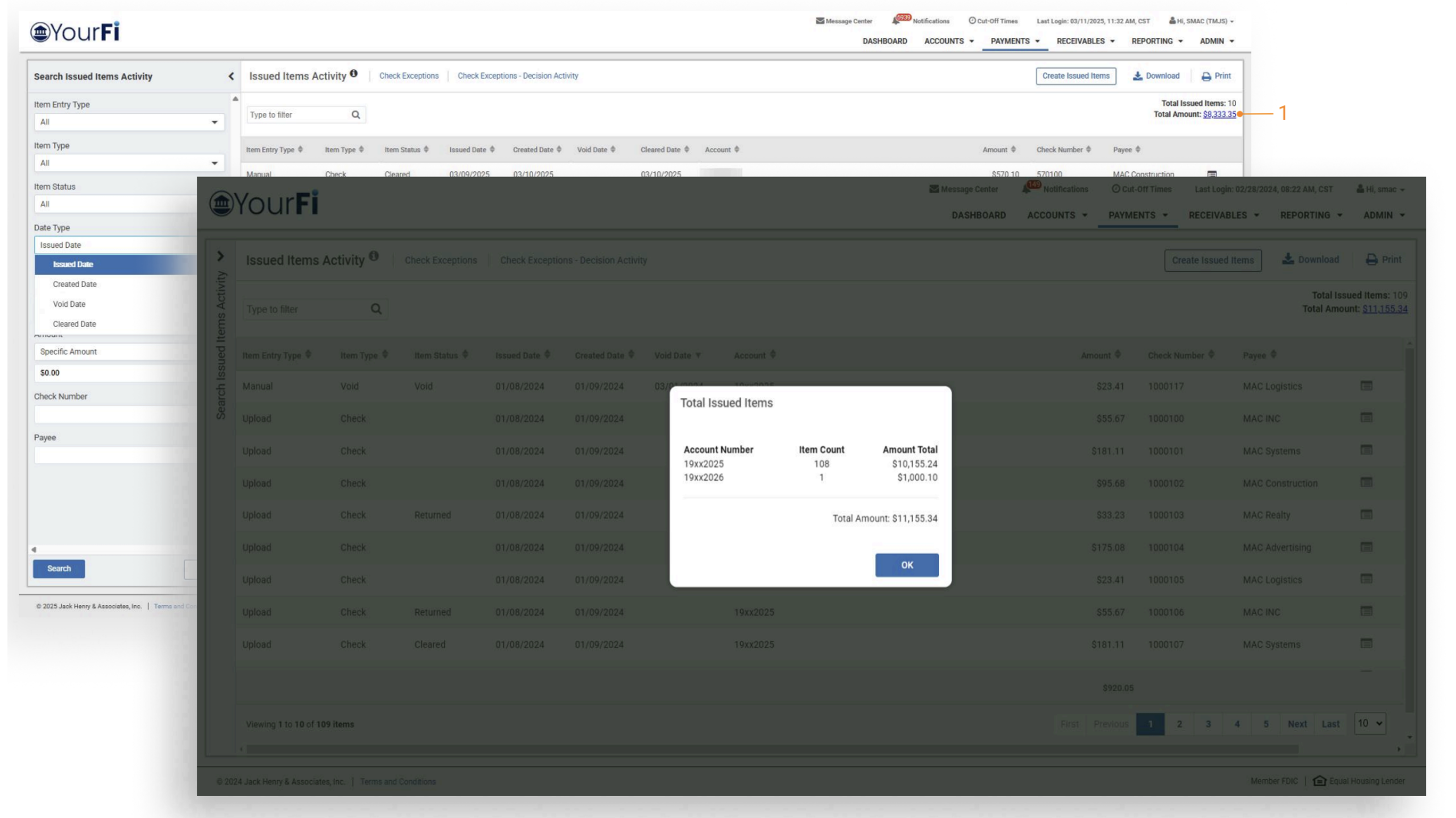 - Issued Items Activity — Navigate to Payments, then to Positive Pay, and channel customers will see the option for Issued Items Activity.