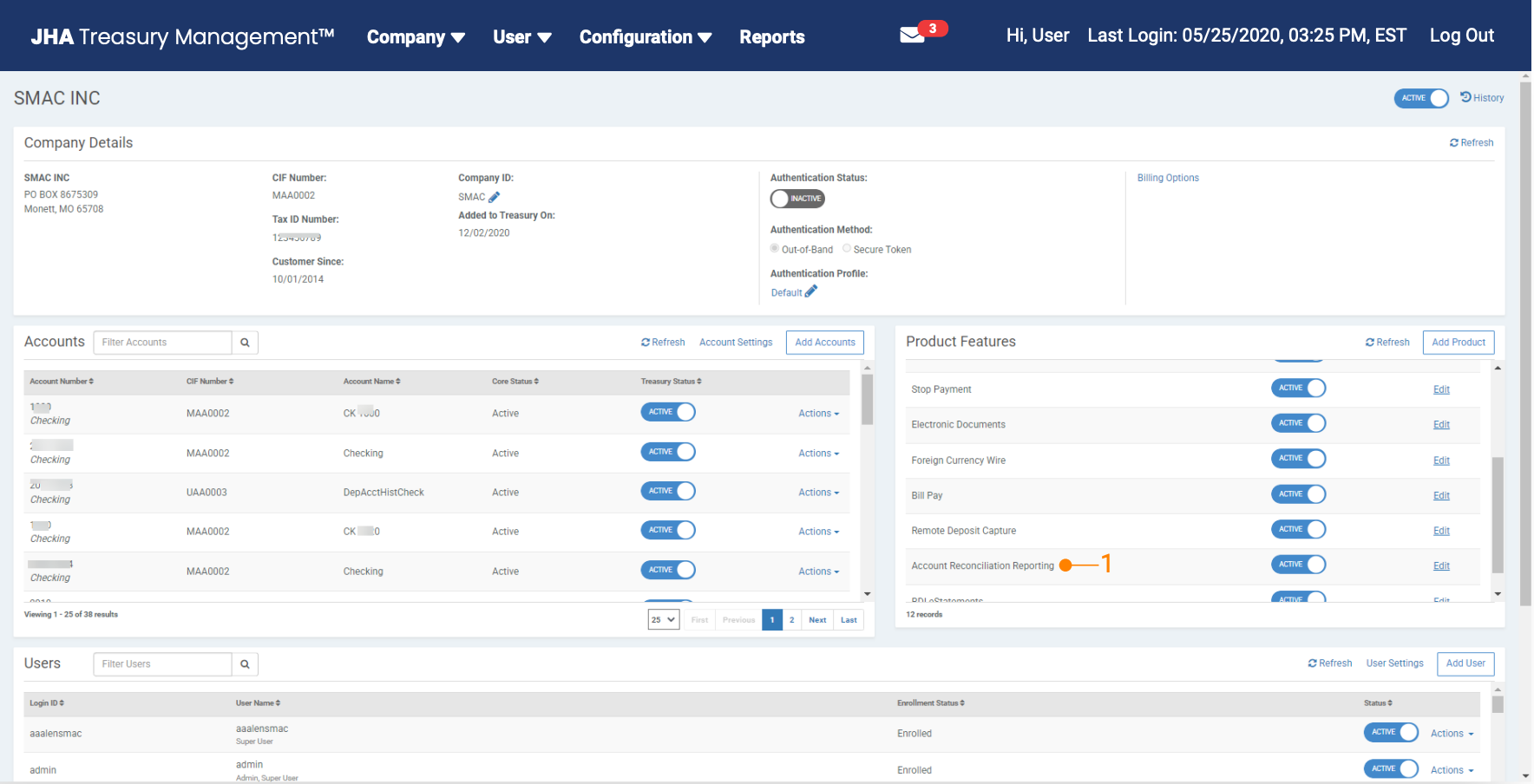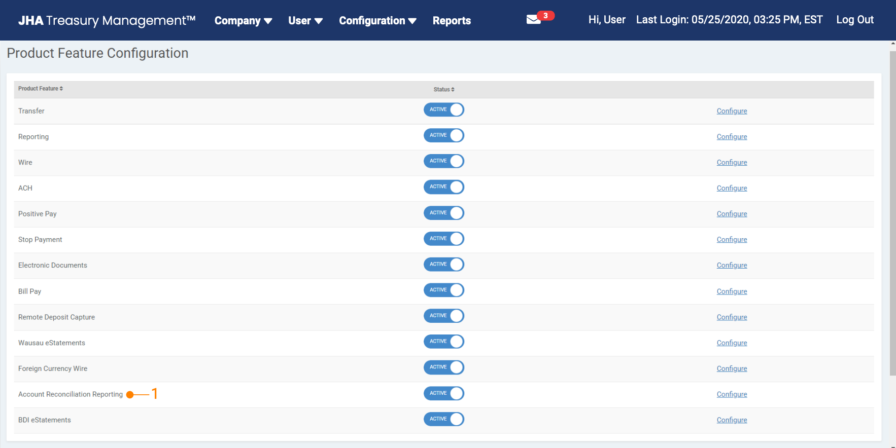 Product Feature: Account reconciliation reporting is located in the Company Product Feature as a standalone product that can be toggled on and off. This configuration needs to be completed at the company level so that each company has access to Account Reconciliation Reports.