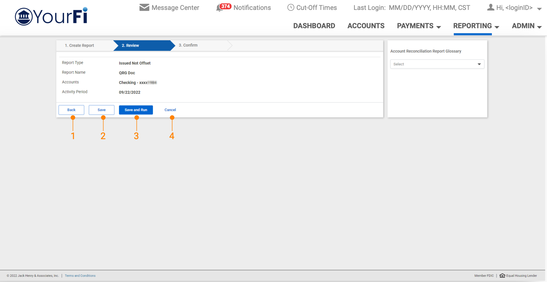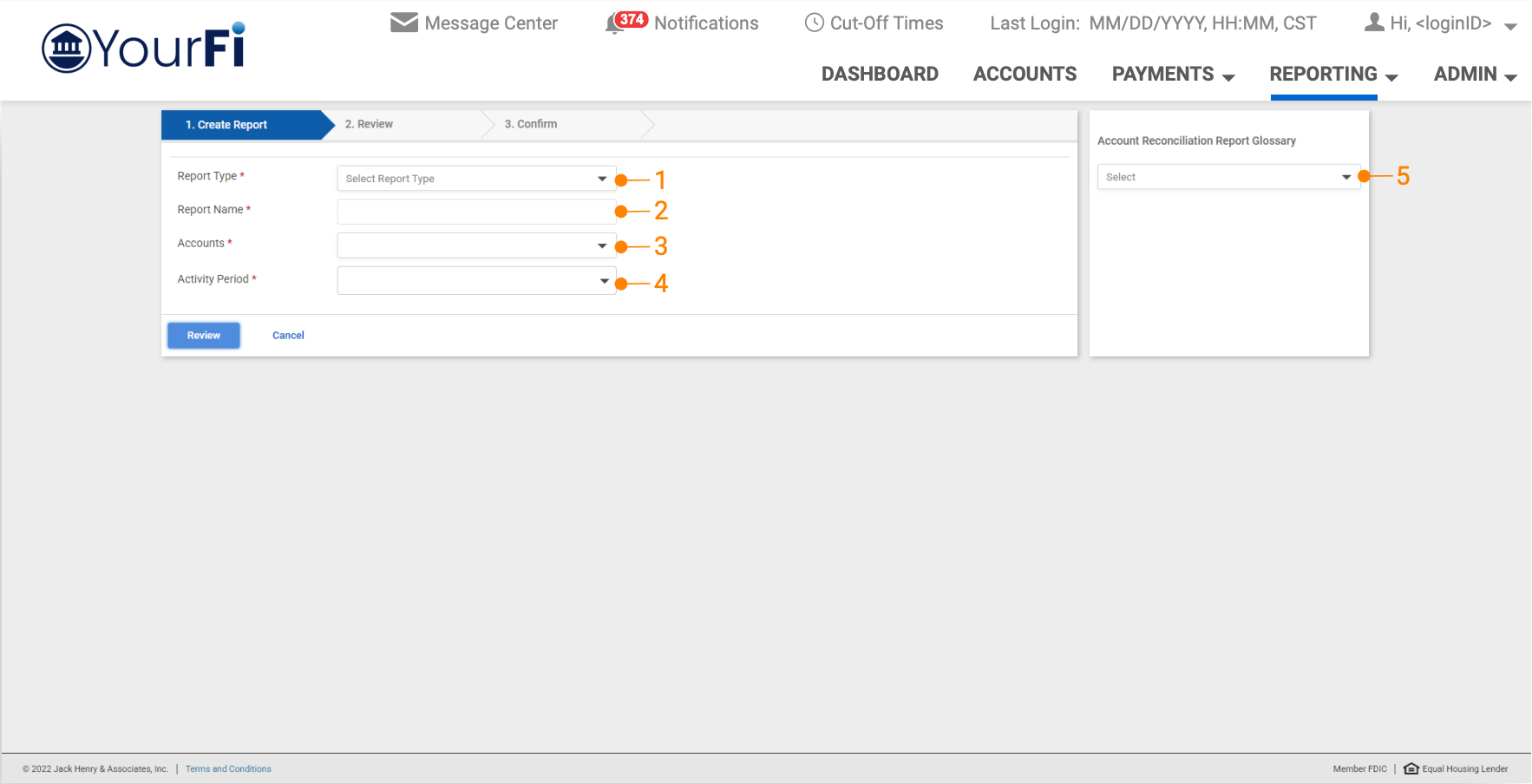 5. Account Reconciliation Reporting Glossary: Provides a dropdown list of report types with a brief description of the selected report type.