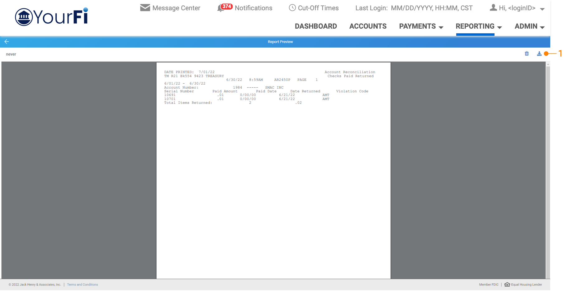 Download Report Viewer: Report viewer displays the specific report when the report name hyperlink is selected. Select the download icon to download the report in PDF format.