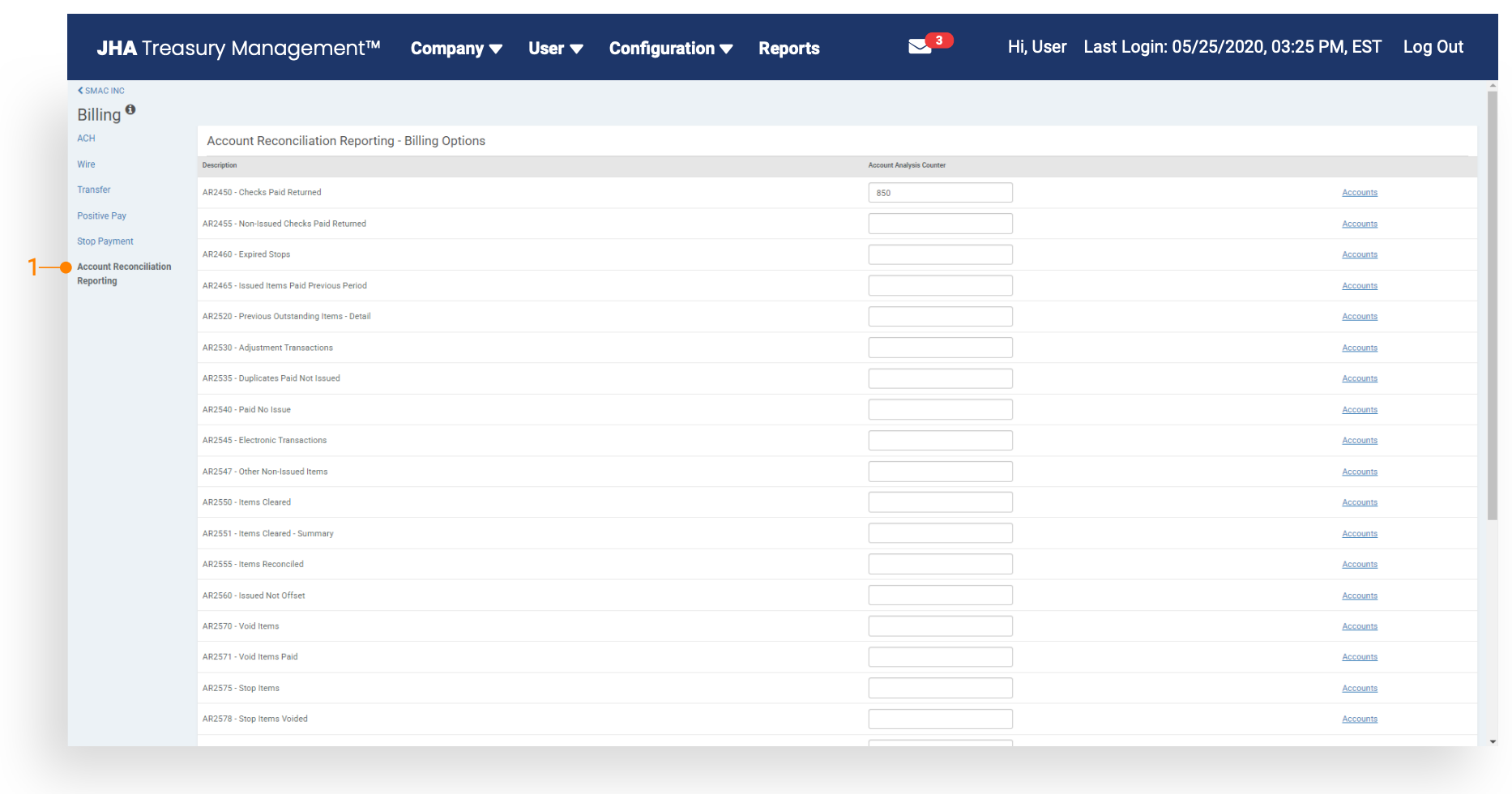 Account Reconciliation Billing: There is an account analysis counter for account reconciliation reporting that will increment each time a report is successfully generated (created) in Treasury Management.