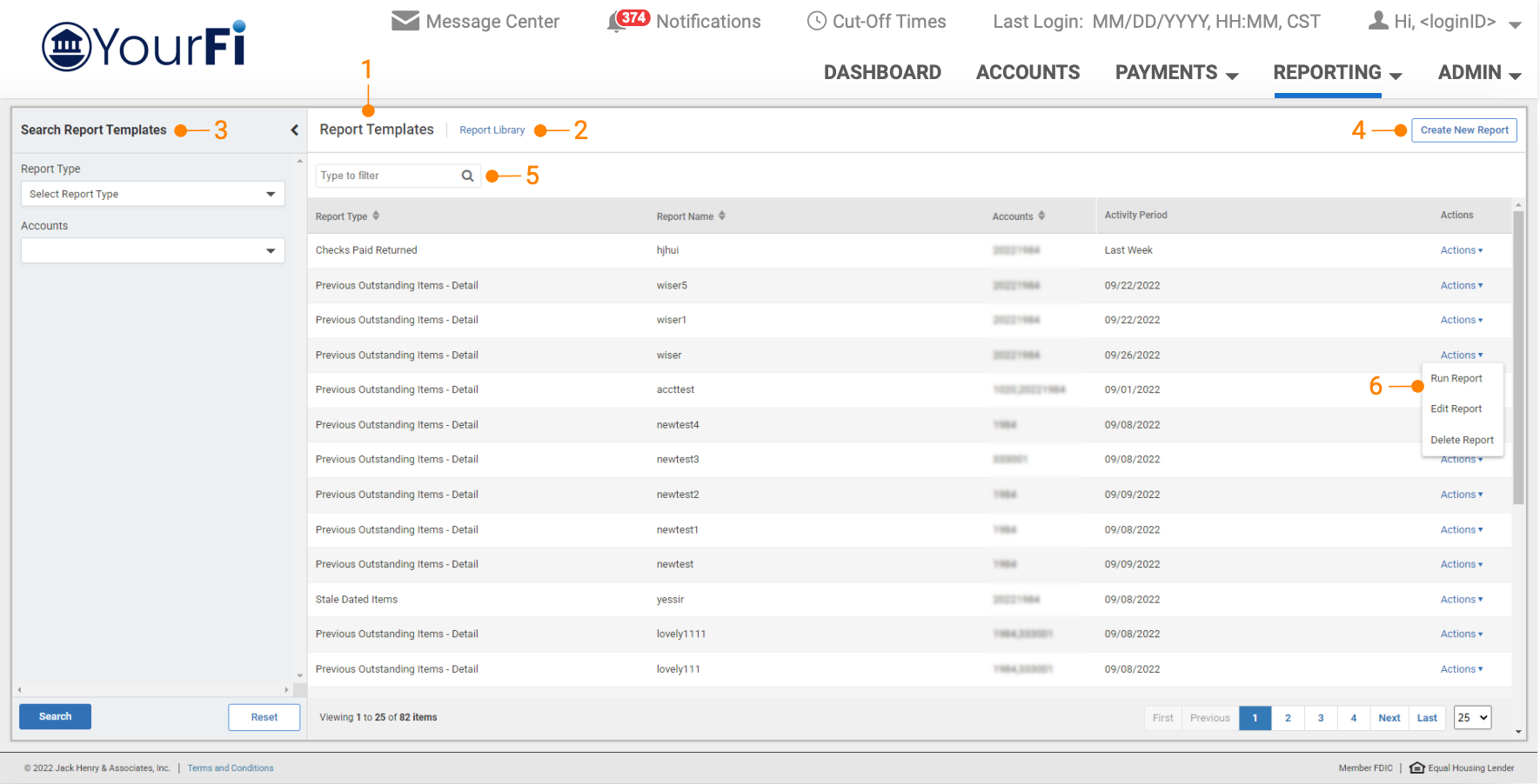 1. Report Templates: Displays the list of your saved report templates by the Report Type, Report Name, Account Number, and Activity period at the time the reports were saved.