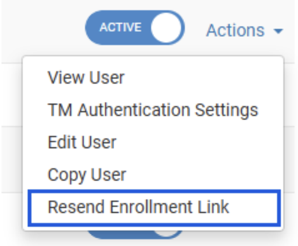 If the user does not take action in the time allowed, a new enrollment link can be generated via Treasury Back Office by selecting Resent Enrollment Link next to the user.