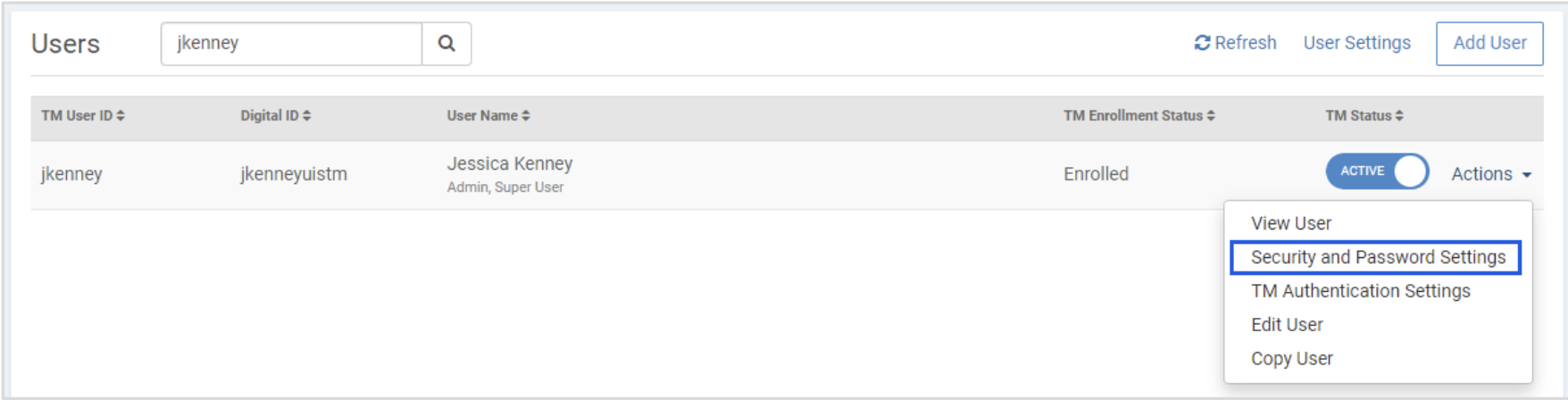- Username: Initiate prompt for user to change their Digital ID at next log in. This does not change their TM User ID.