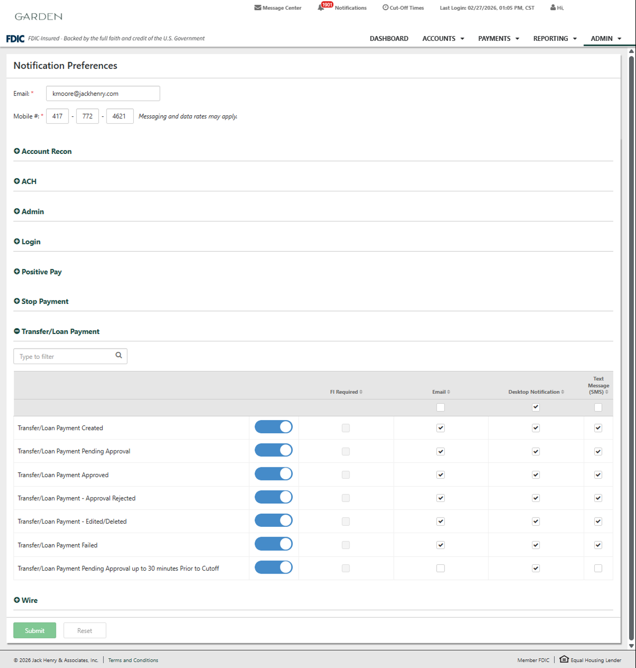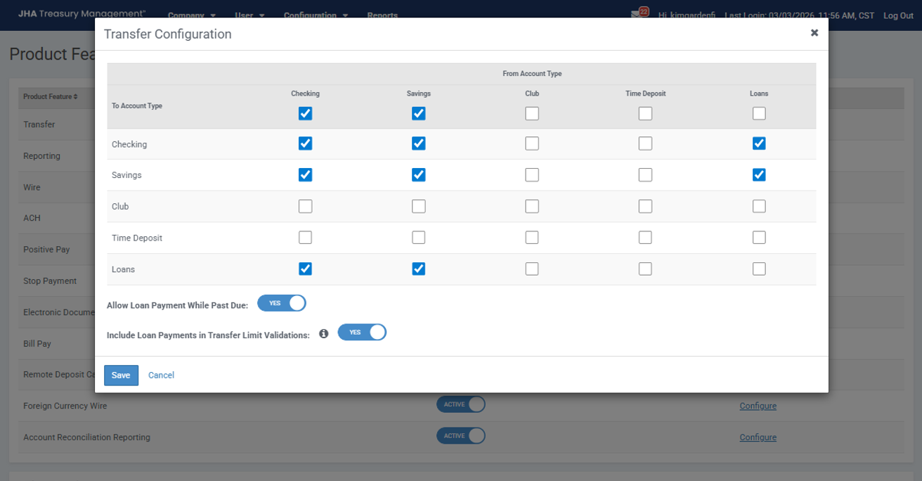 | Transfer Limit Validation | Option to include loan payments in the total daily transfer limit calculations. | Financial institution and company |