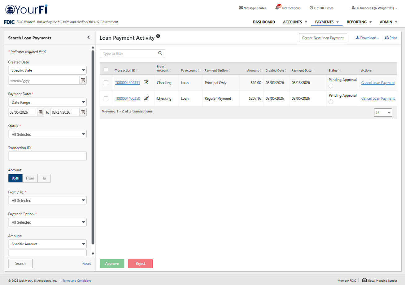 - Reject: Select the checkbox next to the payment and click Reject. Users may also reject a payment from within the transaction ID details view.