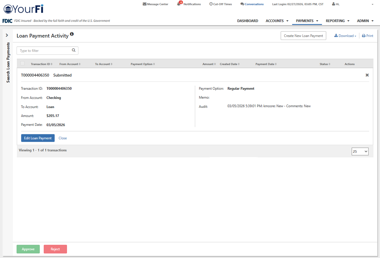 - Edit Internal Transfer/Loan Payment: Allows users to edit transfers from the accounts selected.