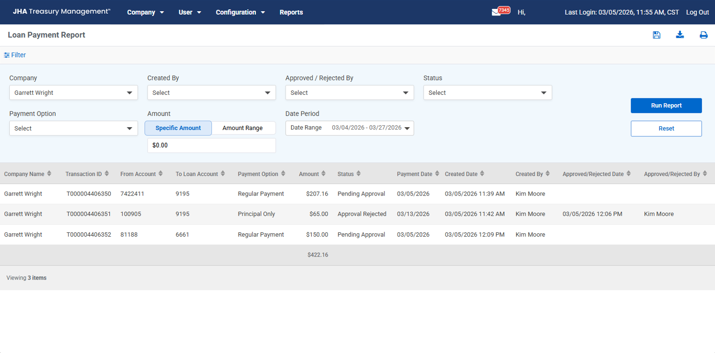 This report serves as a centralized hub for tracking various loan payments and their statuses. Users can apply filters to the report by the following fields to narrow down activity results: