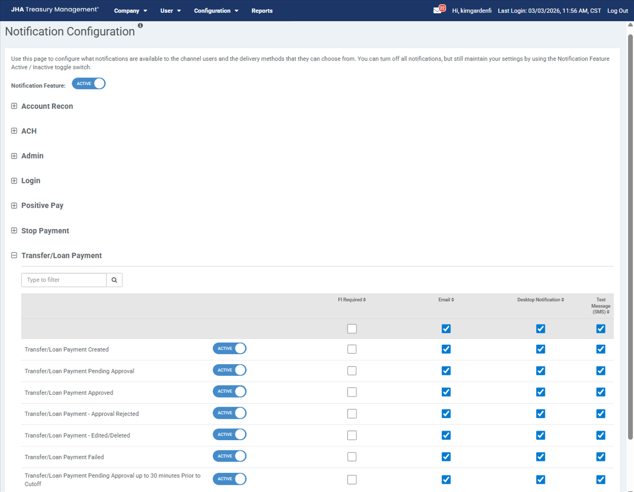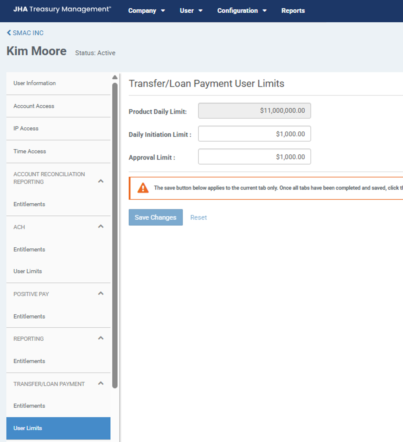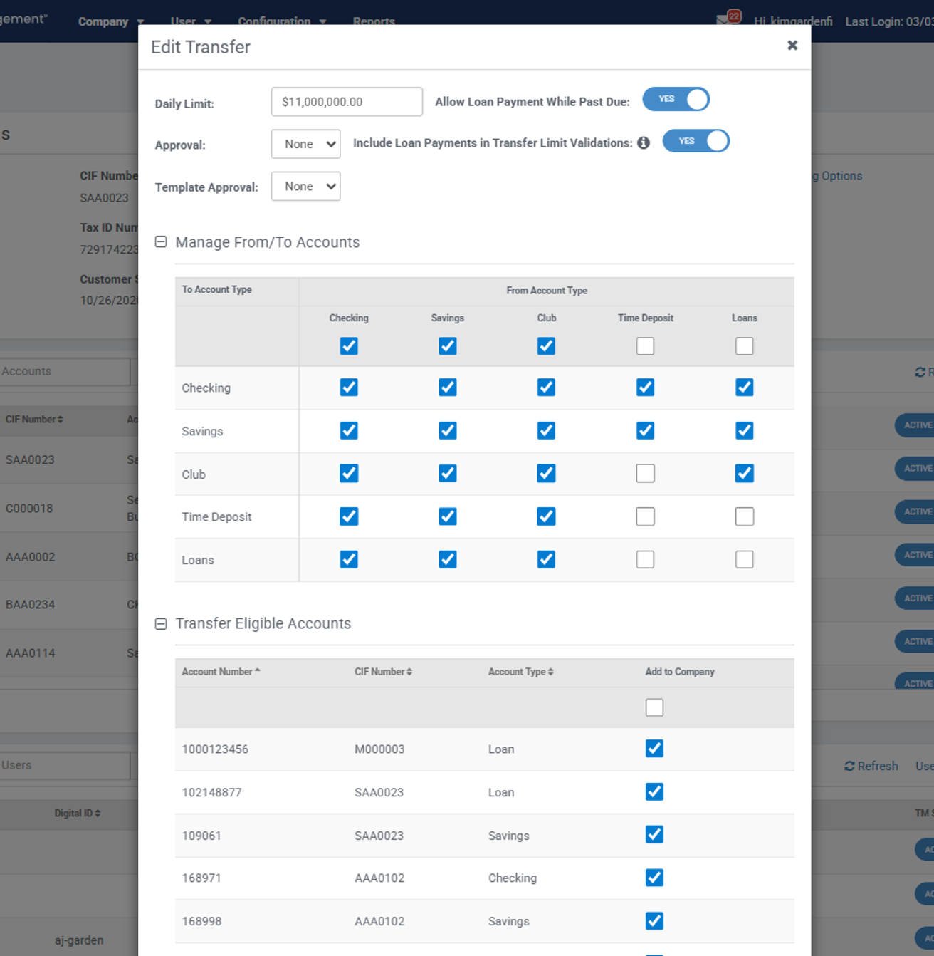 | Daily Limits | Company-defined caps on the total dollar volume of transfers (includes loan payments unless configuration is set to not include) | Company |