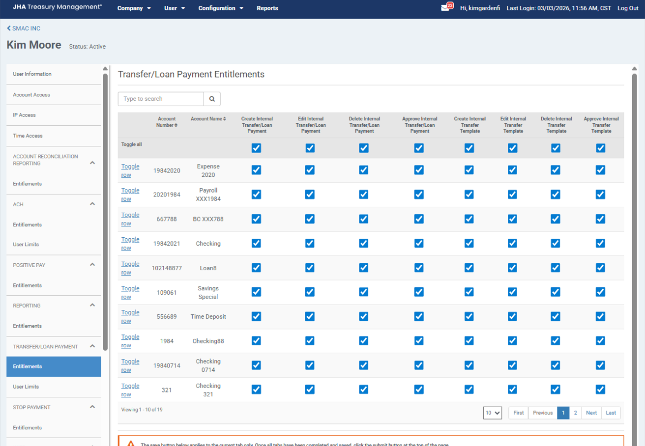 - Approve Internal Transfer/Loan Payment: Allows users to approve a transfer from the selected accounts if it is within their approval limit.