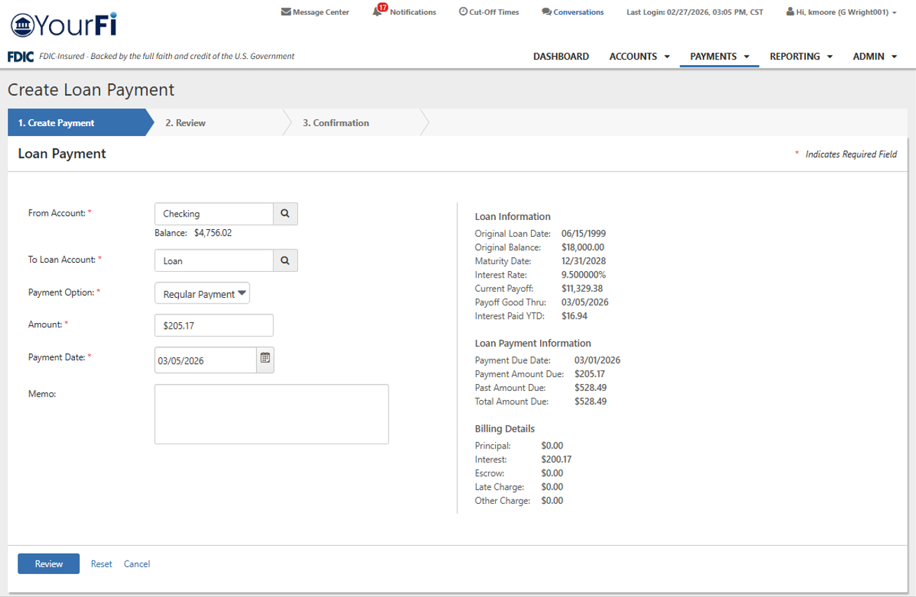 The input screen is designed to provide full transparency of the loan’s current standing before a payment is submitted. Navigate to Payments > Transfers > Create Loan Payment.