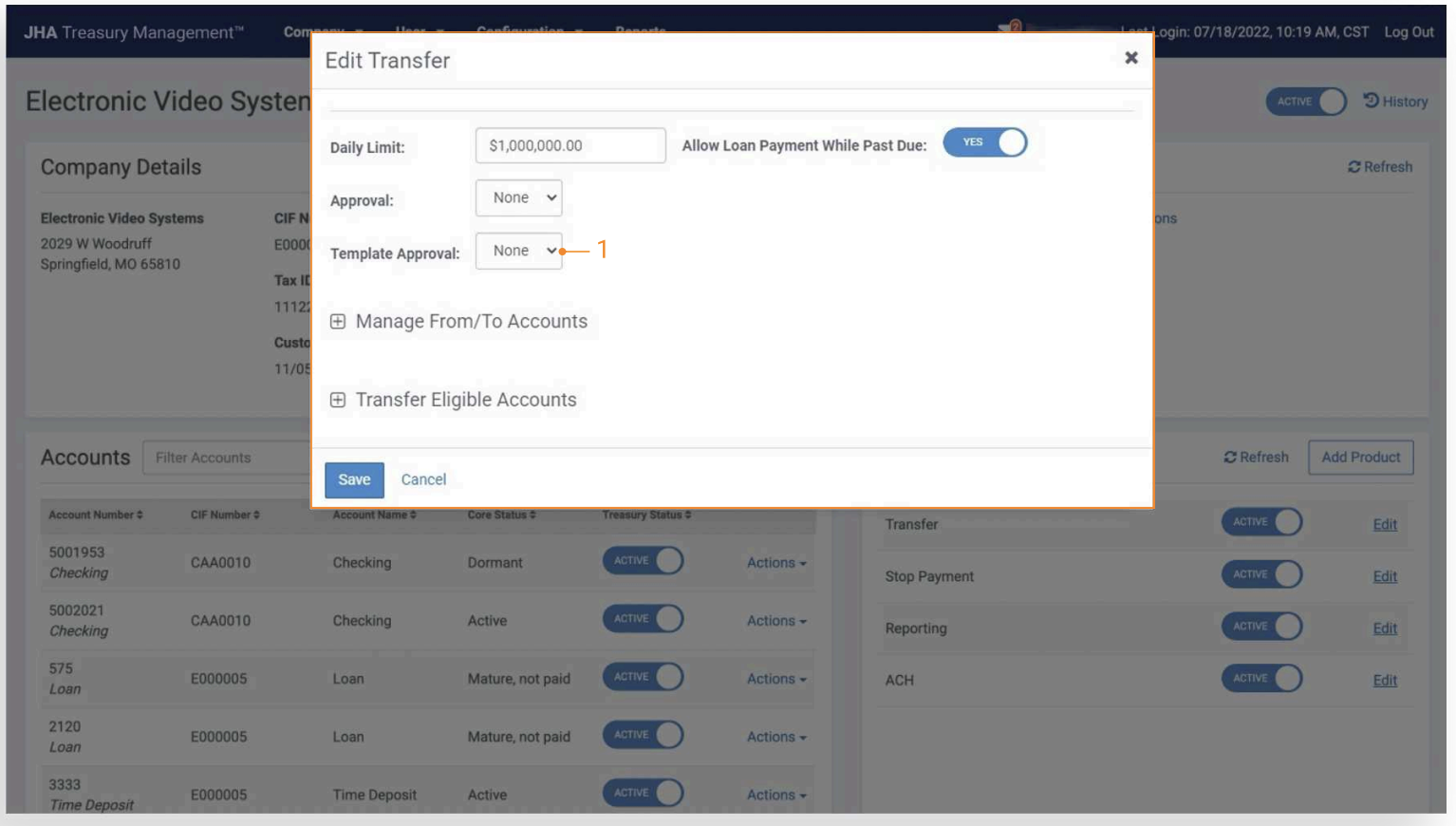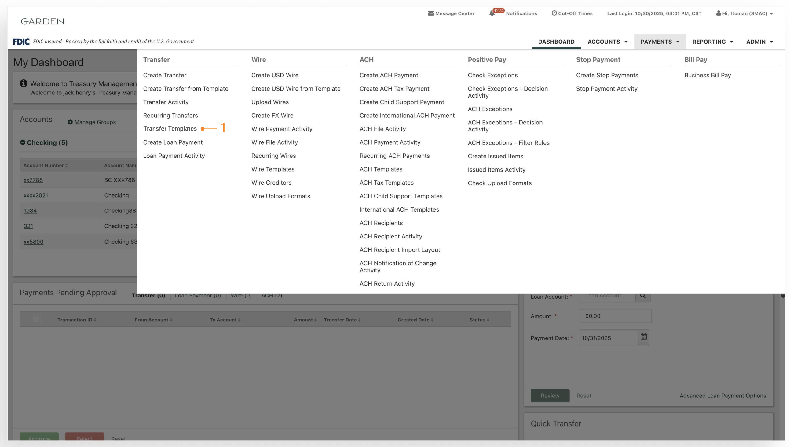 Users can create and save transfer templates to quickly initiate internal transfers. Templates can be set up to fund transfers from one account to another, from one account to multiple accounts, or multiple accounts to one. In addition, templates can be set up for cash concentration purposes.