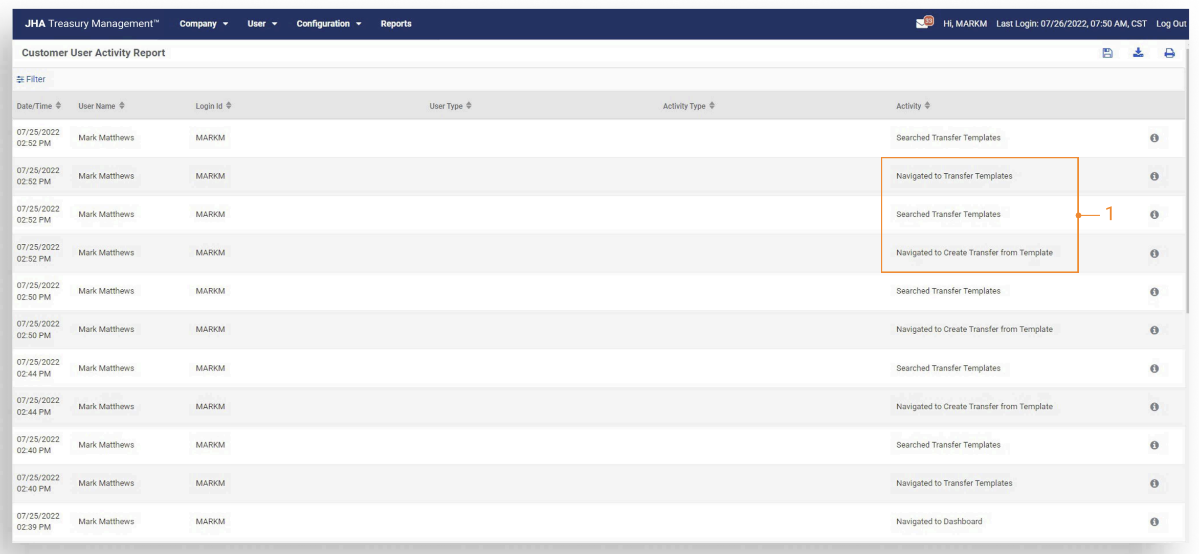 Displays user activity related to Transfer Templates.