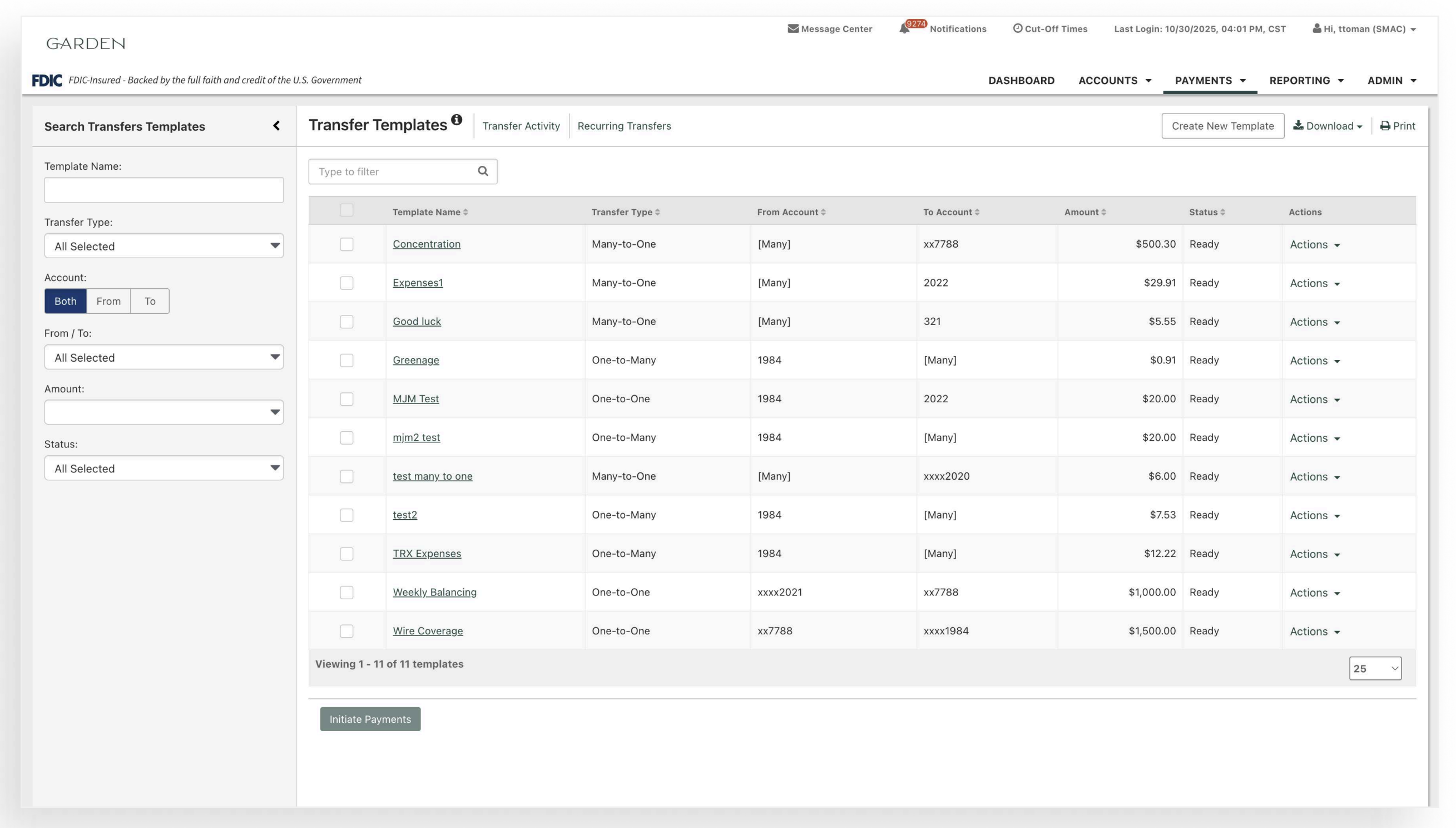 - Within the Transfer Templates listing, users can filter the results, create payments from a single selected template, modify a template, print the template listing or details.