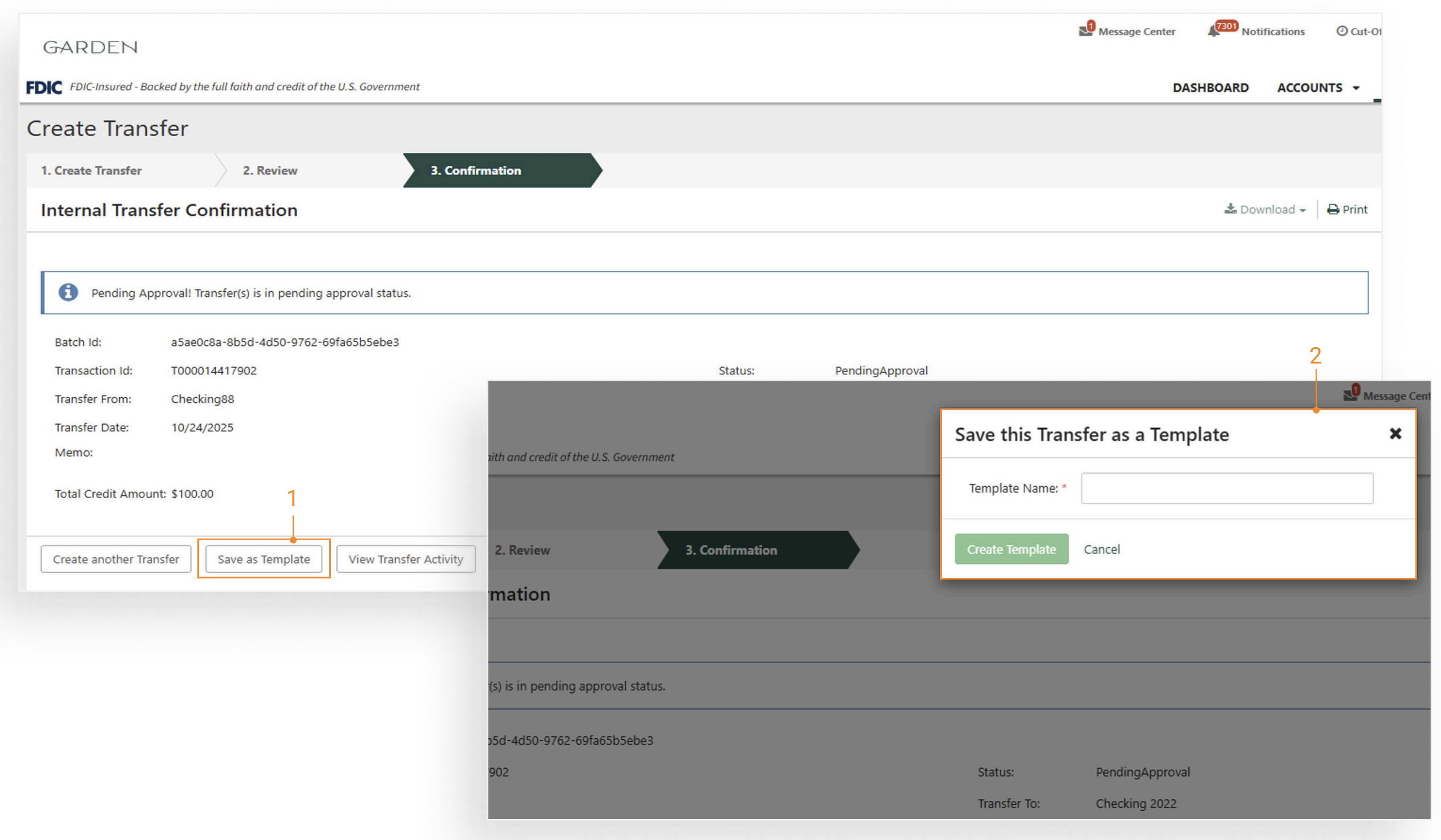 Furthermore, users have the ability to create transfer templates (one to one, one to many, and many to one) from transfer payments. These new templates may be awaiting an approval or be available immediately to initiate a transfer payment. This feature is available for desktop as well as mobile.
