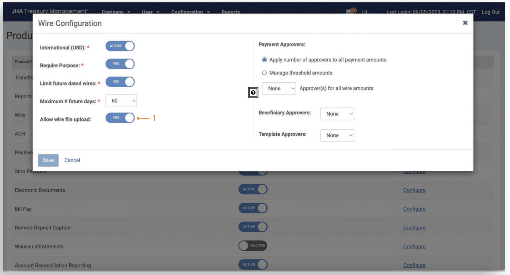 To enable this feature for a specific company, navigate to their Company Details page and select Wires from the Product Features widget. Selections will be applied when the Product Configuration is set to Yes.