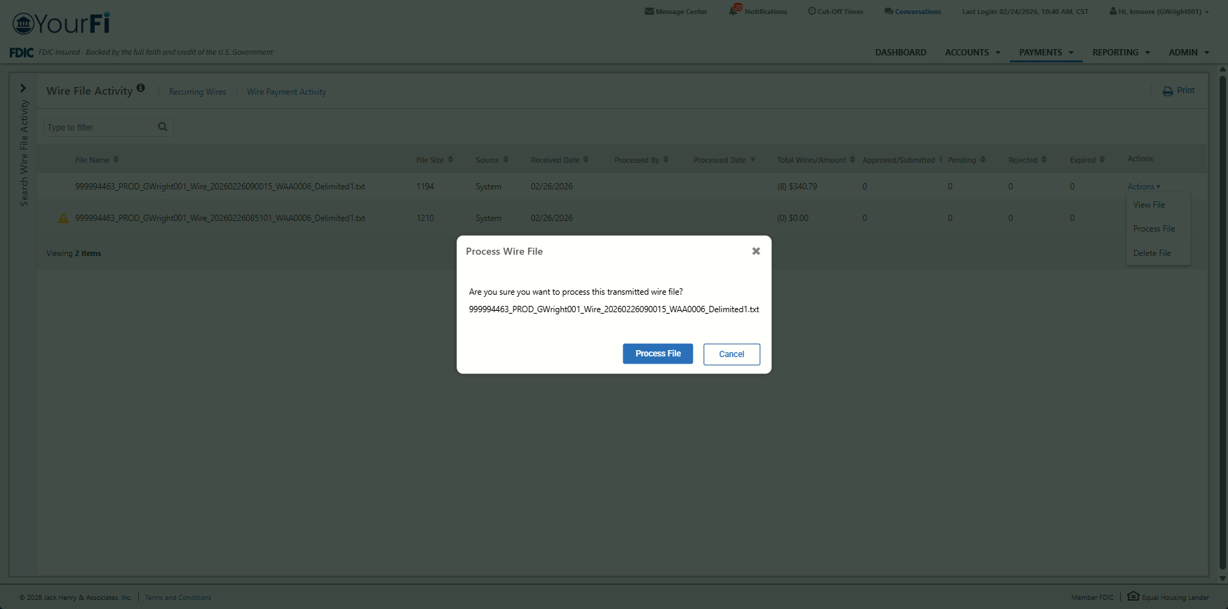 When the action to Process a file is taken, the user will be presented with a confirmation message asking if they are sure they want to process this transmitted wire file. The message will include the wire file name and a button to Process File or Cancel.