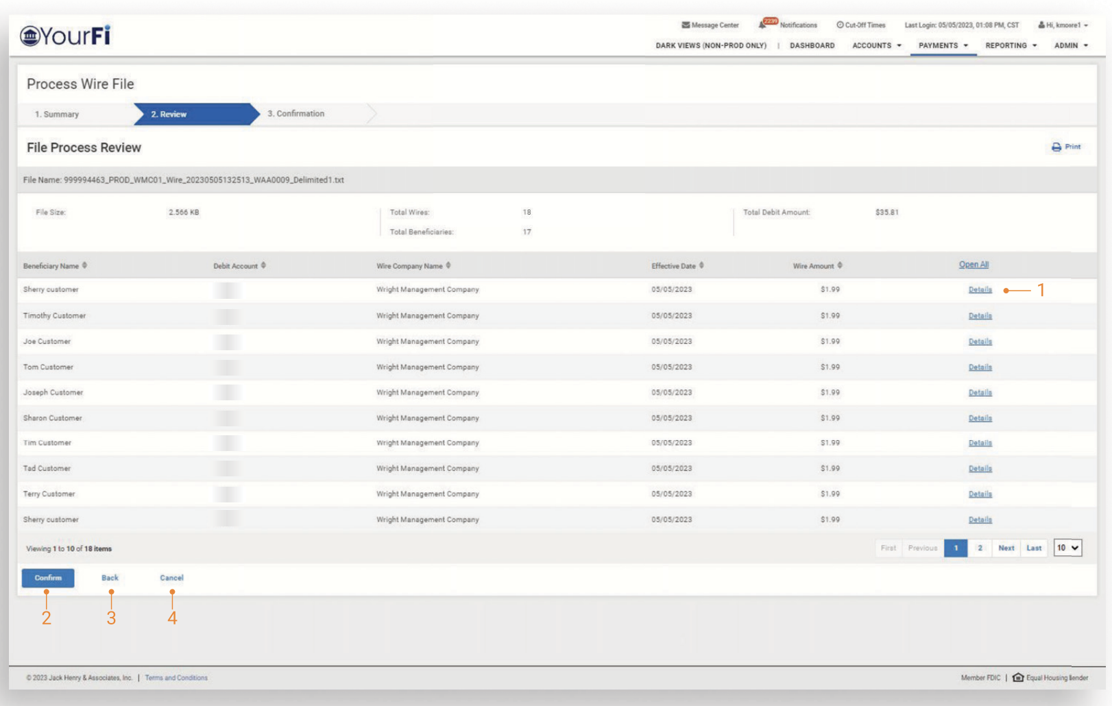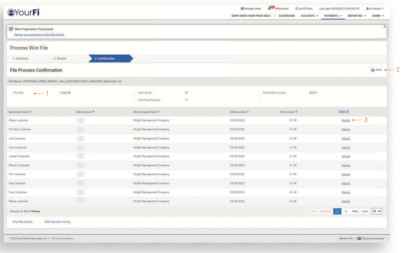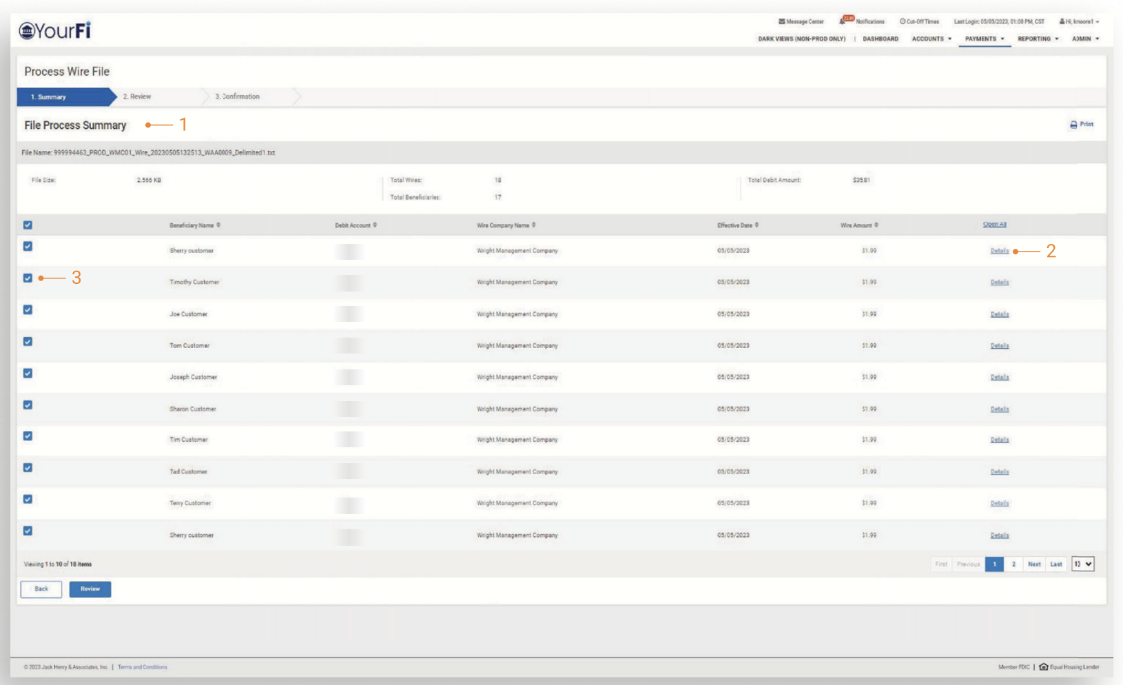 After a file has been selected for processing, users can view a summary of file information including the file name, summary information (File Size, Total Wires and Beneficiaries, and Total Debit Amount) and a list of wires included in the file.