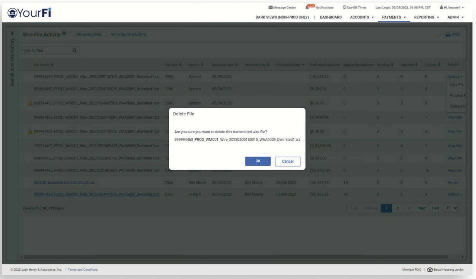 OK – selecting this button will delete the wire file from the database and from the Wire File Activity page. No further action will be allowed on this file.