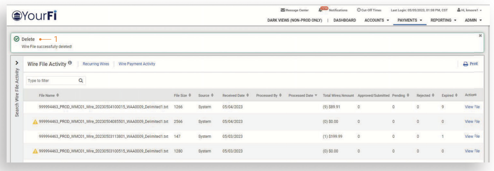 When a wire file is successfully deleted, the user will be returned to the Wire File Activity page with a Delete successful message.