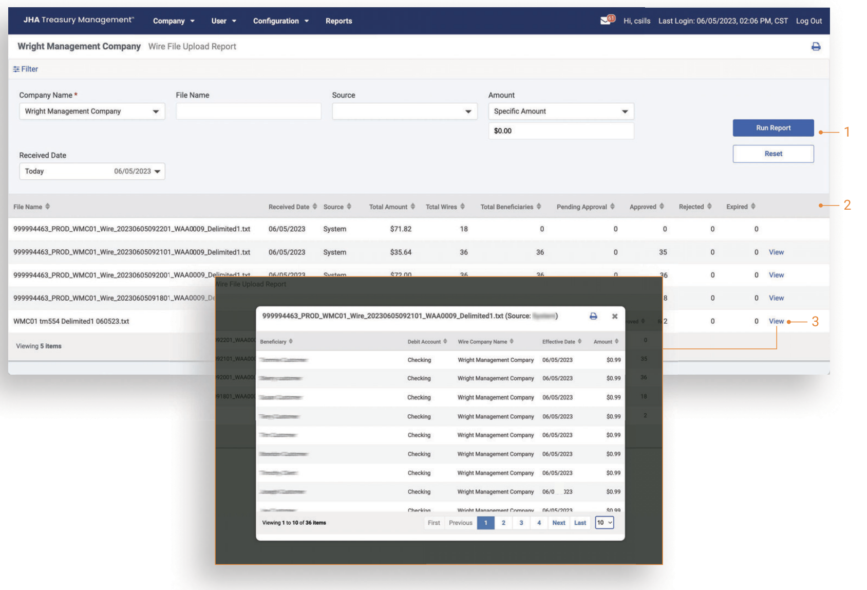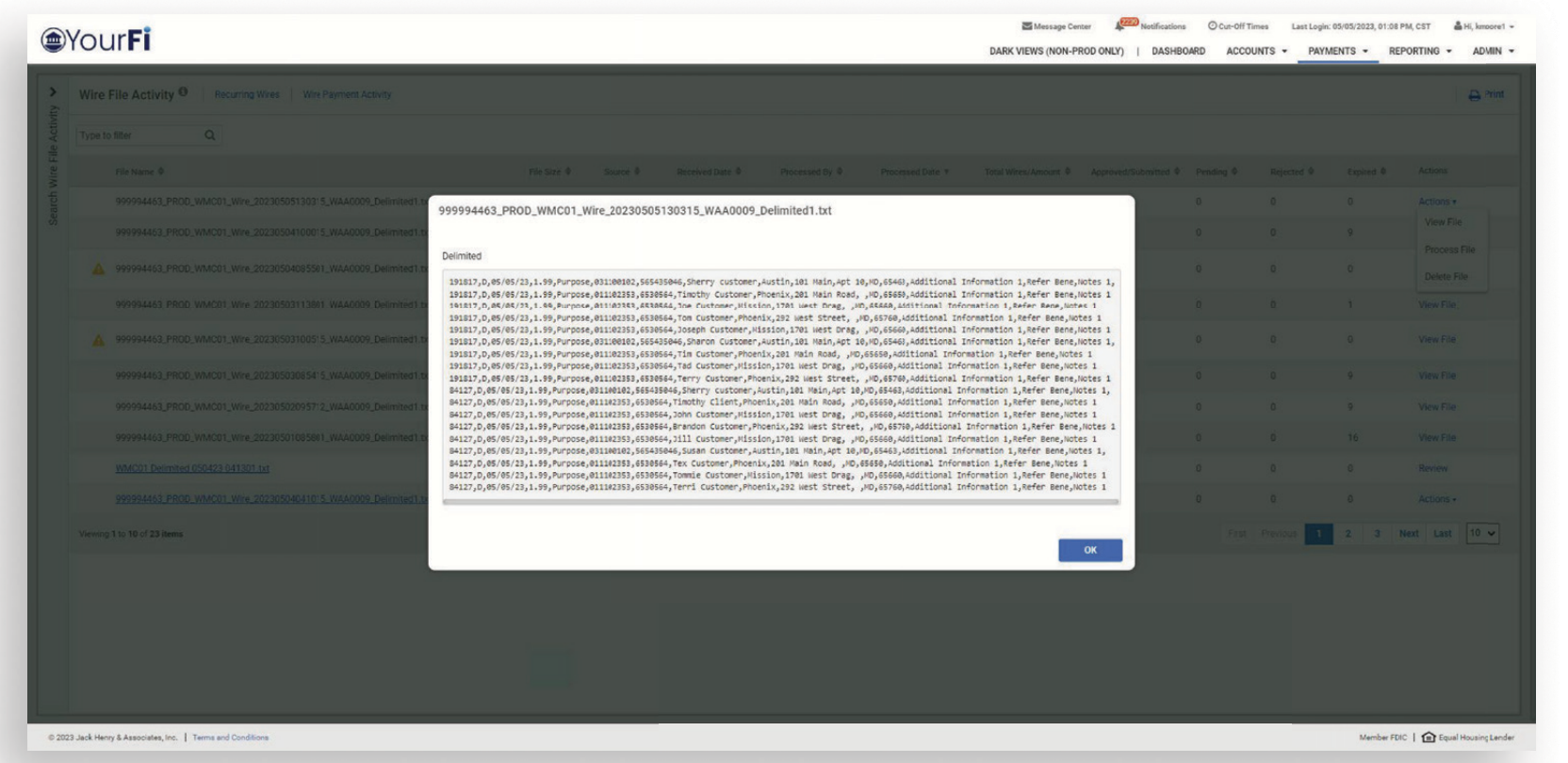 Select View to display the list of wires included in the file. The list of wire transactions will open in a modal.