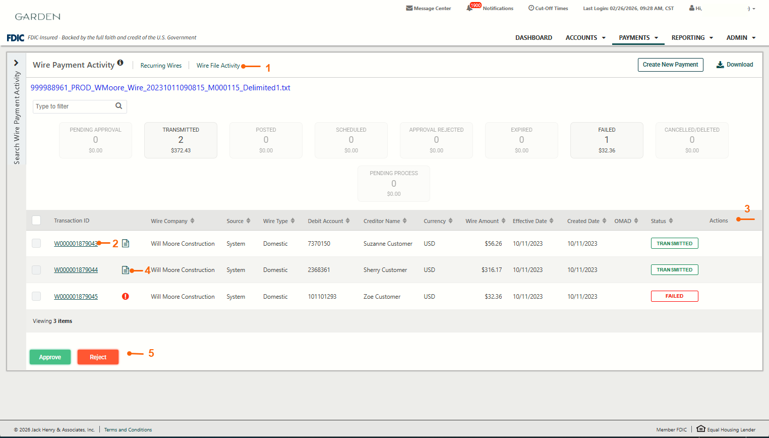 If a payment is Pending Approval, users can Approve or Reject. If a wire is scheduled, selecting Cancel Wire will cancel the transaction.