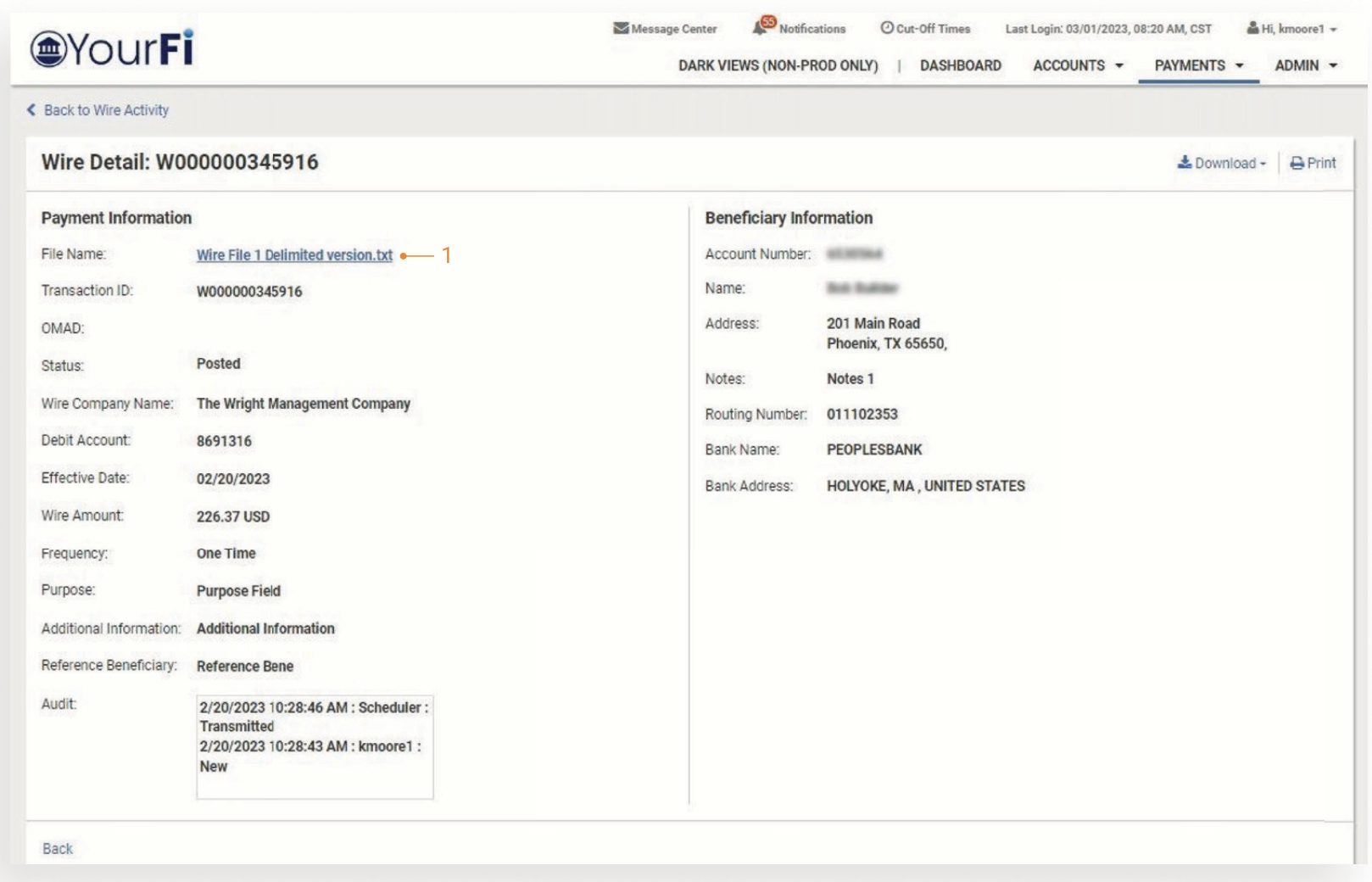 Select the Transaction ID to view details. (Note: This includes the File Name for the uploaded wire).
