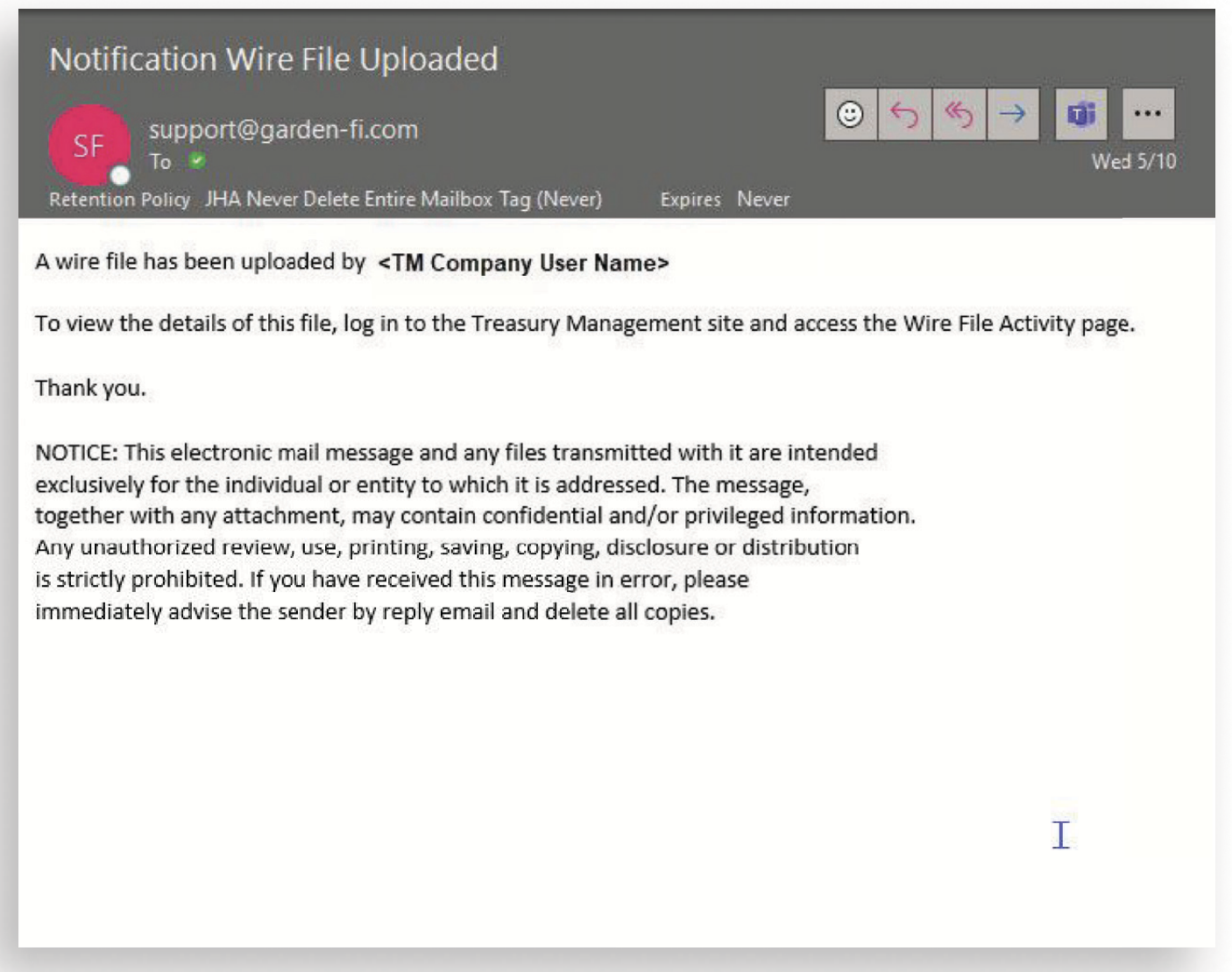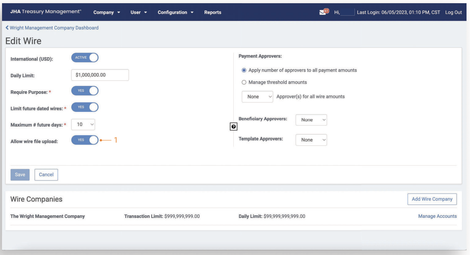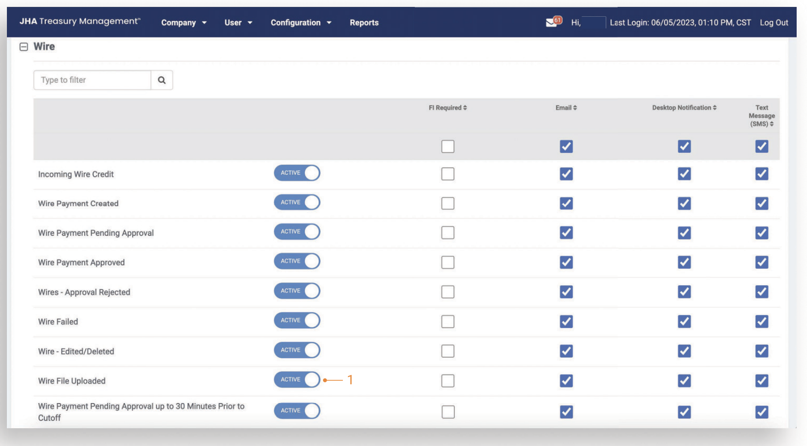 Wire File Uploaded will alert a user when a wire file has been successfully uploaded or a transmitted file has been processed in Treasury Management. To receive this notification, a user needs to be entitled for the Wire Company as well as have the following user entitlements enabled: