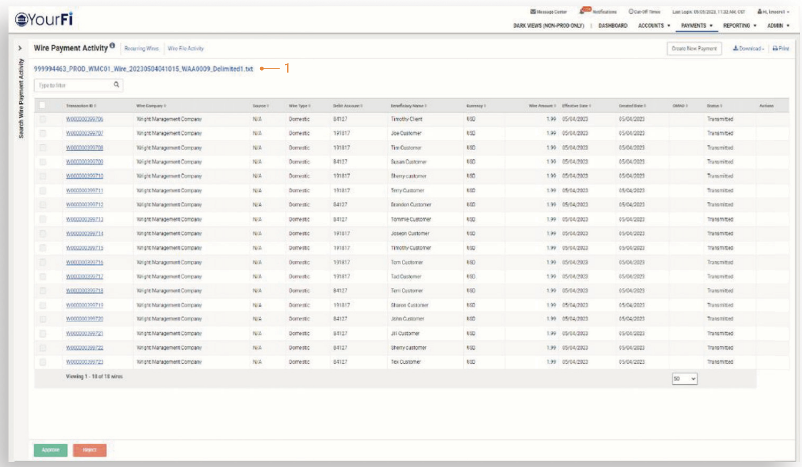 Users can select one, multiple, or all wires to approve or reject.