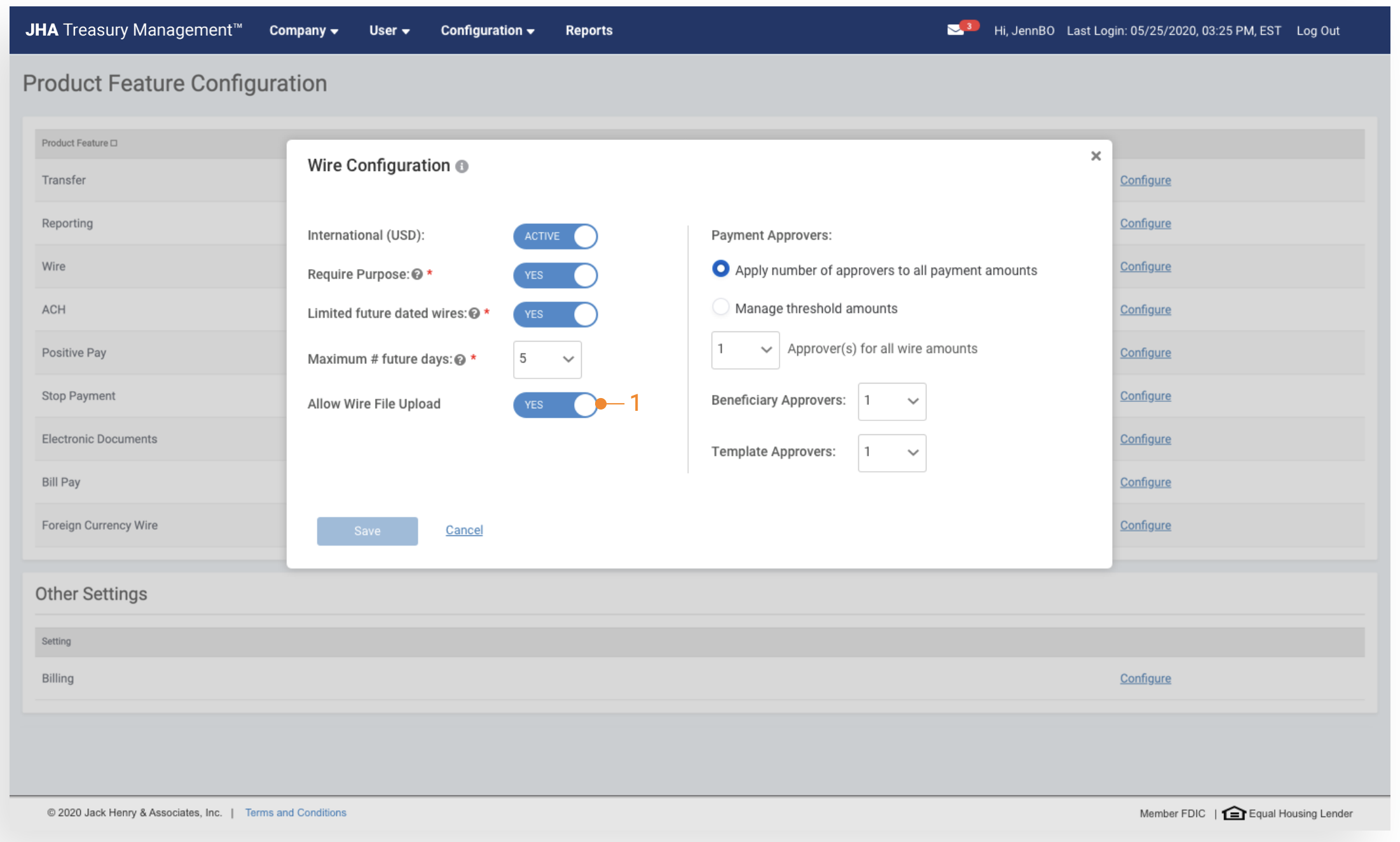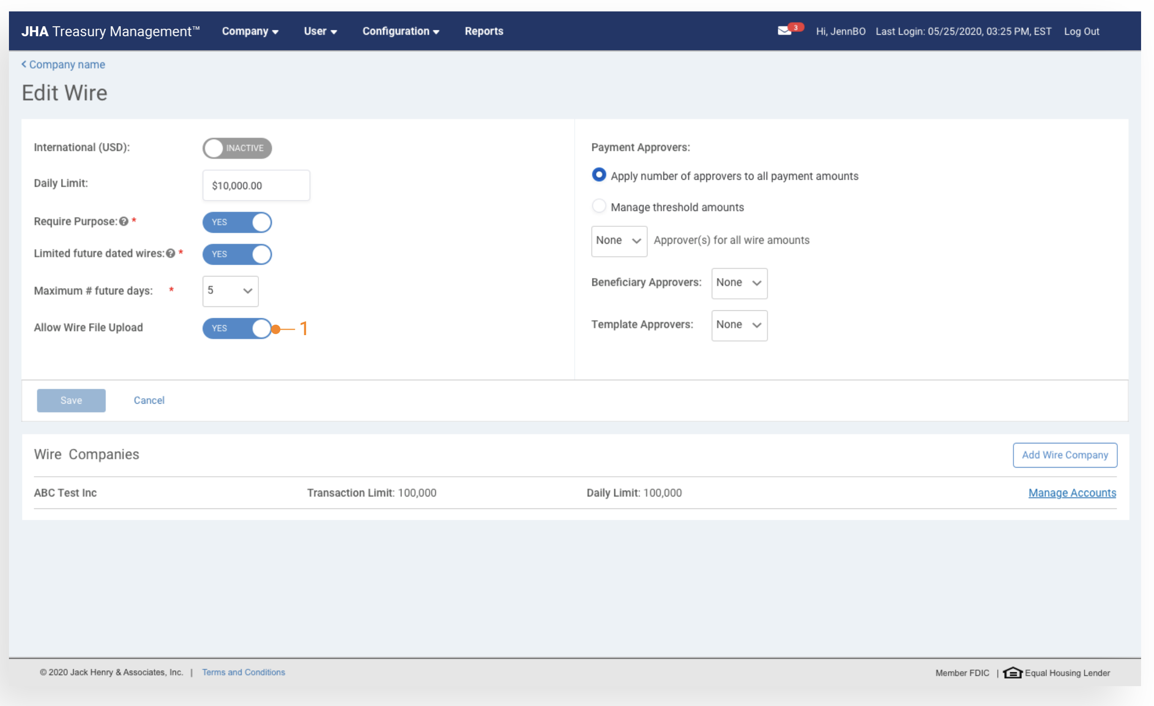 Wire File Upload can be enabled within the Wire Configuration of the Product Feature Configuration. Once it has been enabled, configuration settings for active companies will be applied.