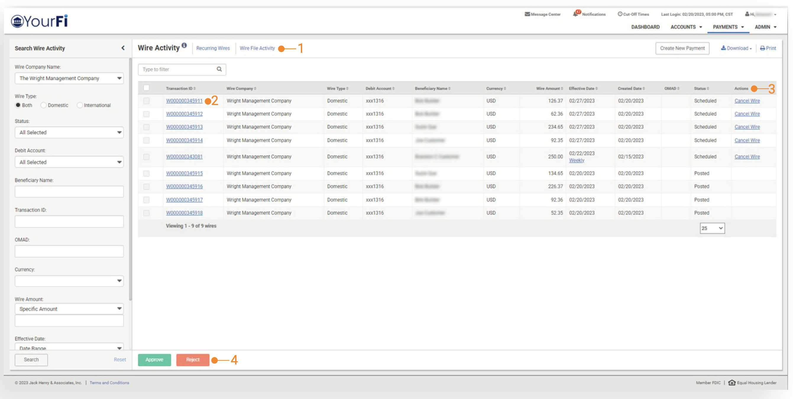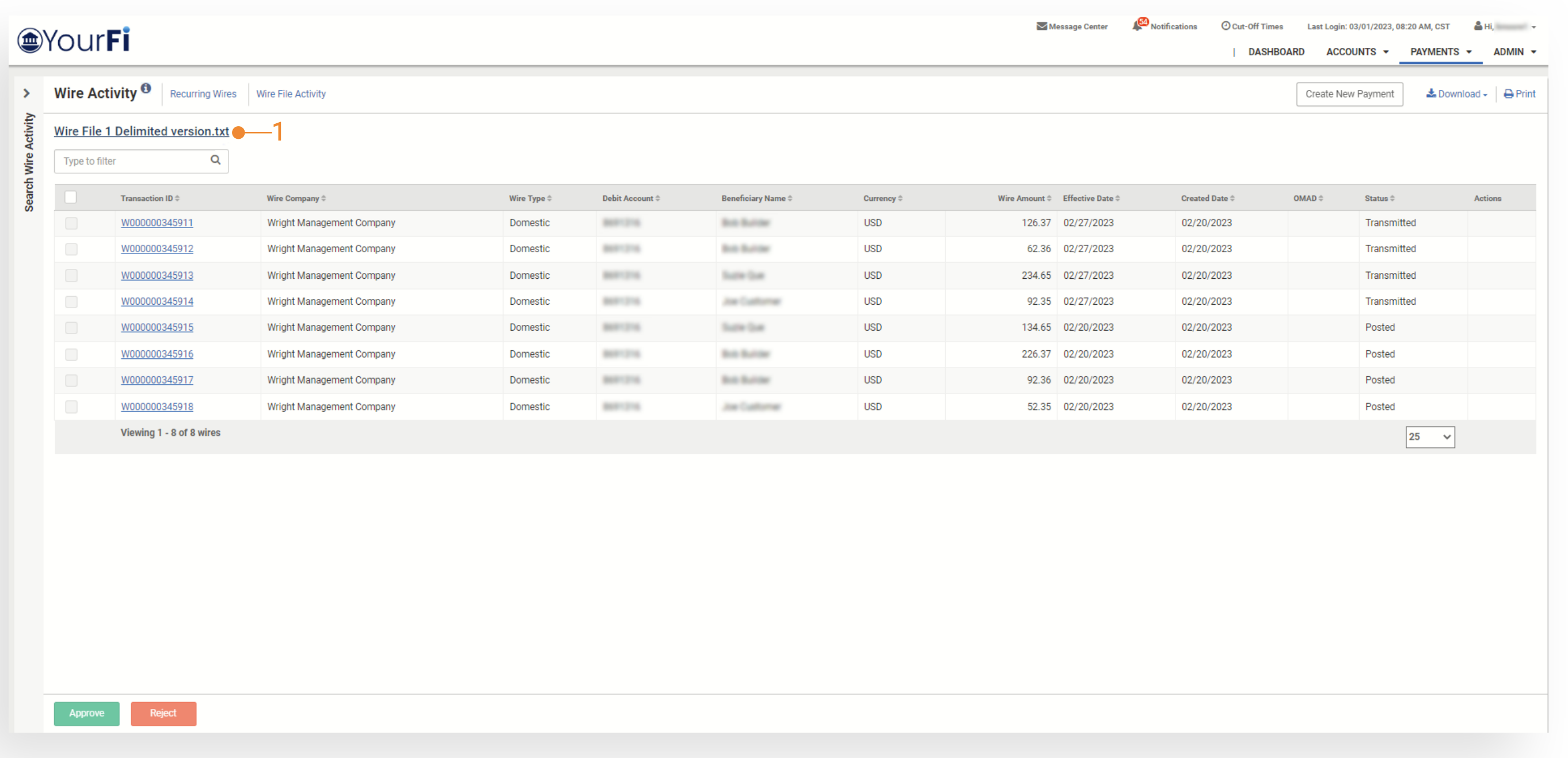 If a payment is Pending Approval, selecting Approve or Reject from the Actions menu drop-down will update the status for that wire.