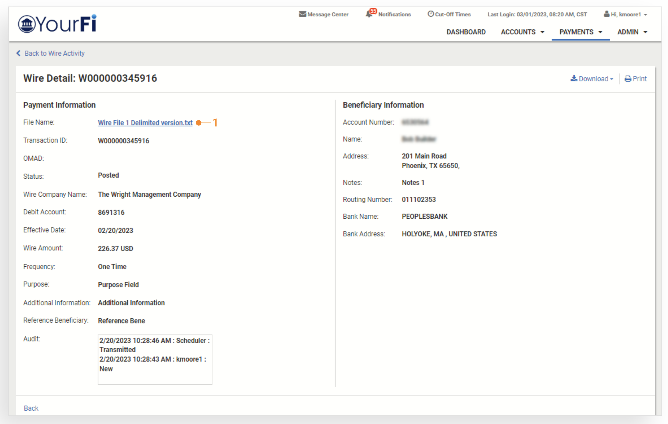 To view the details of the wire file, select the file name. The user will be taken to the Wire File Activity page with the details specific to the file containing this transaction.