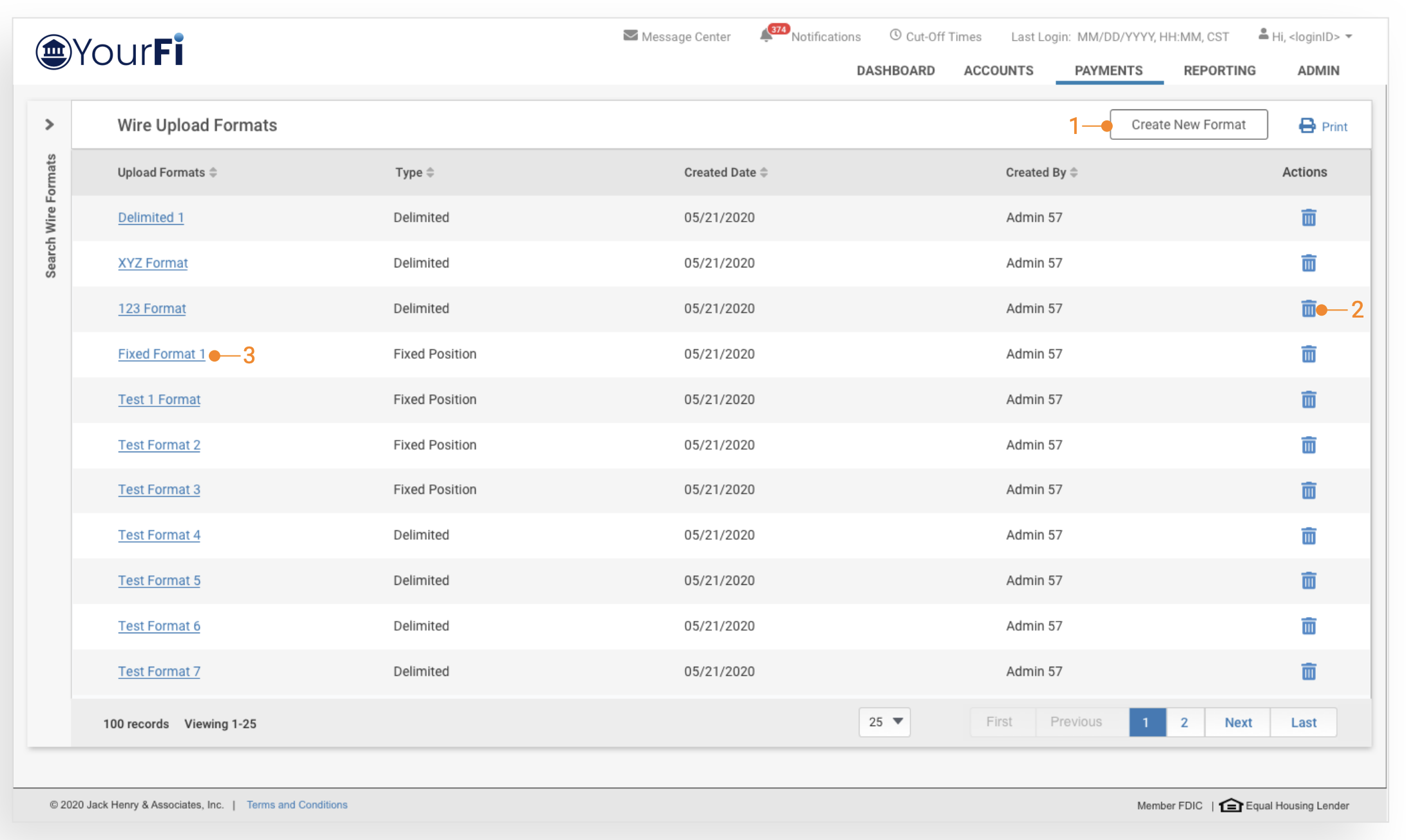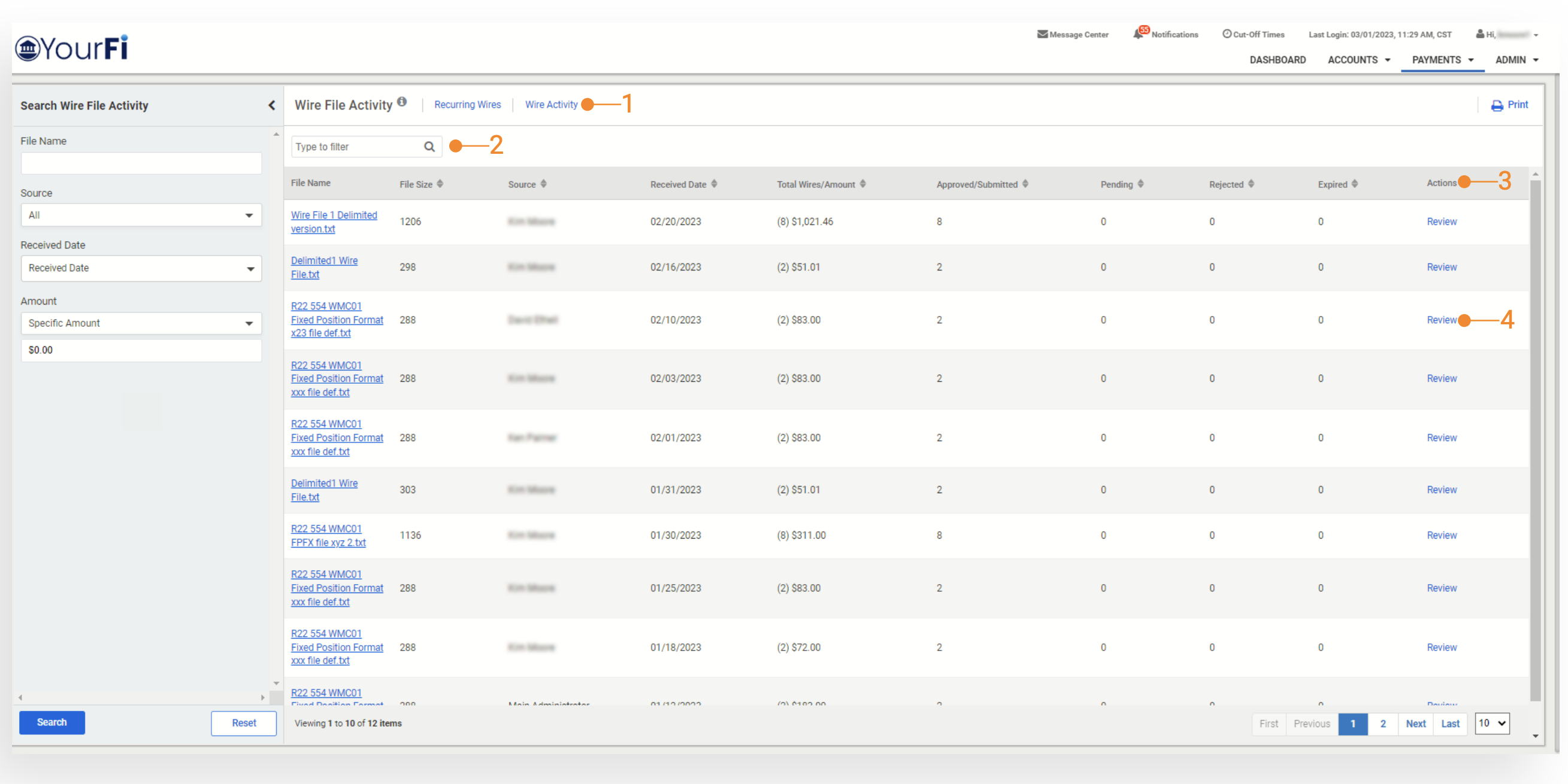 Wire File Activity view will display a list of wire files that have been uploaded.