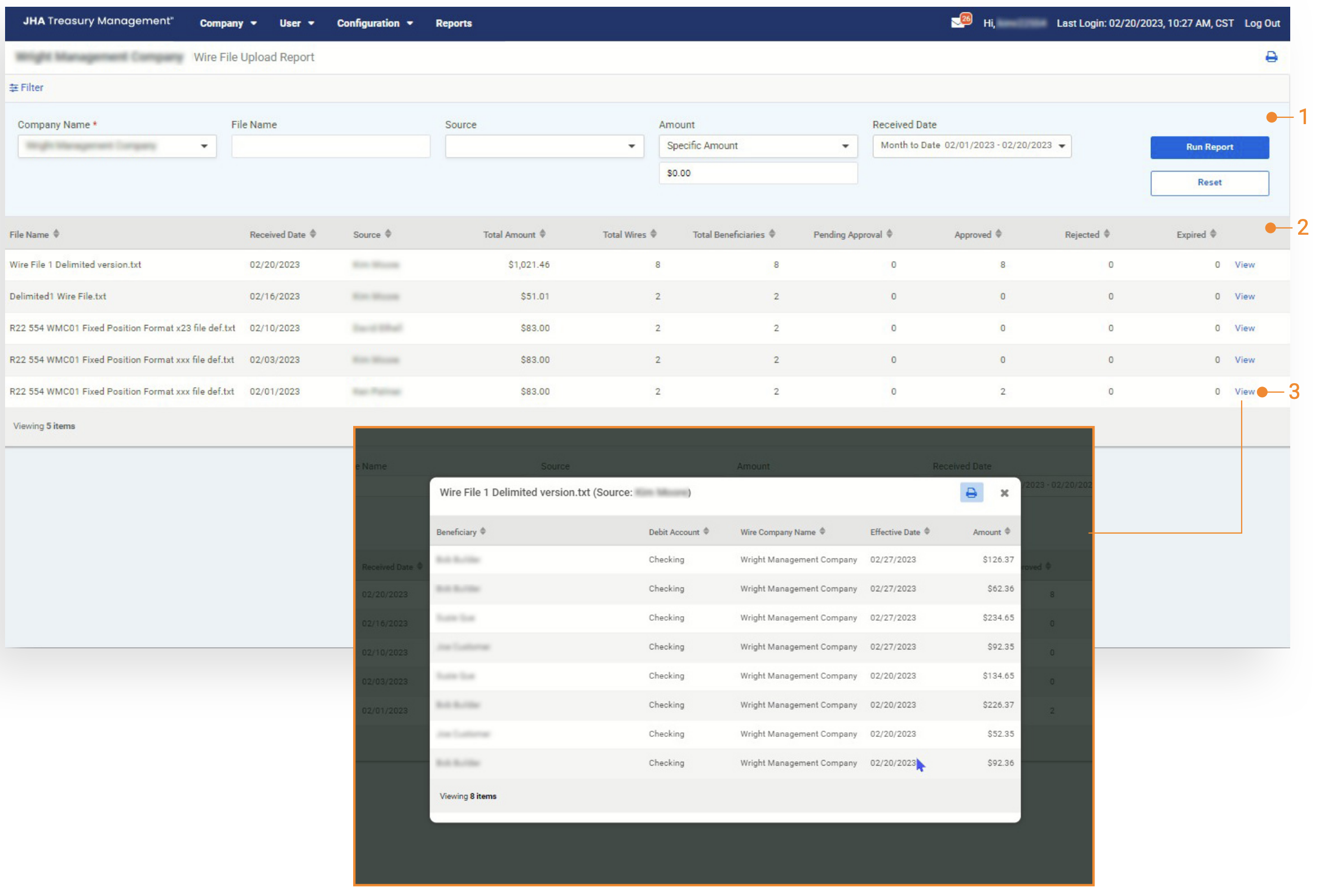 View to display the list of wires included in the file. The list of wire transactions will open in a modal.