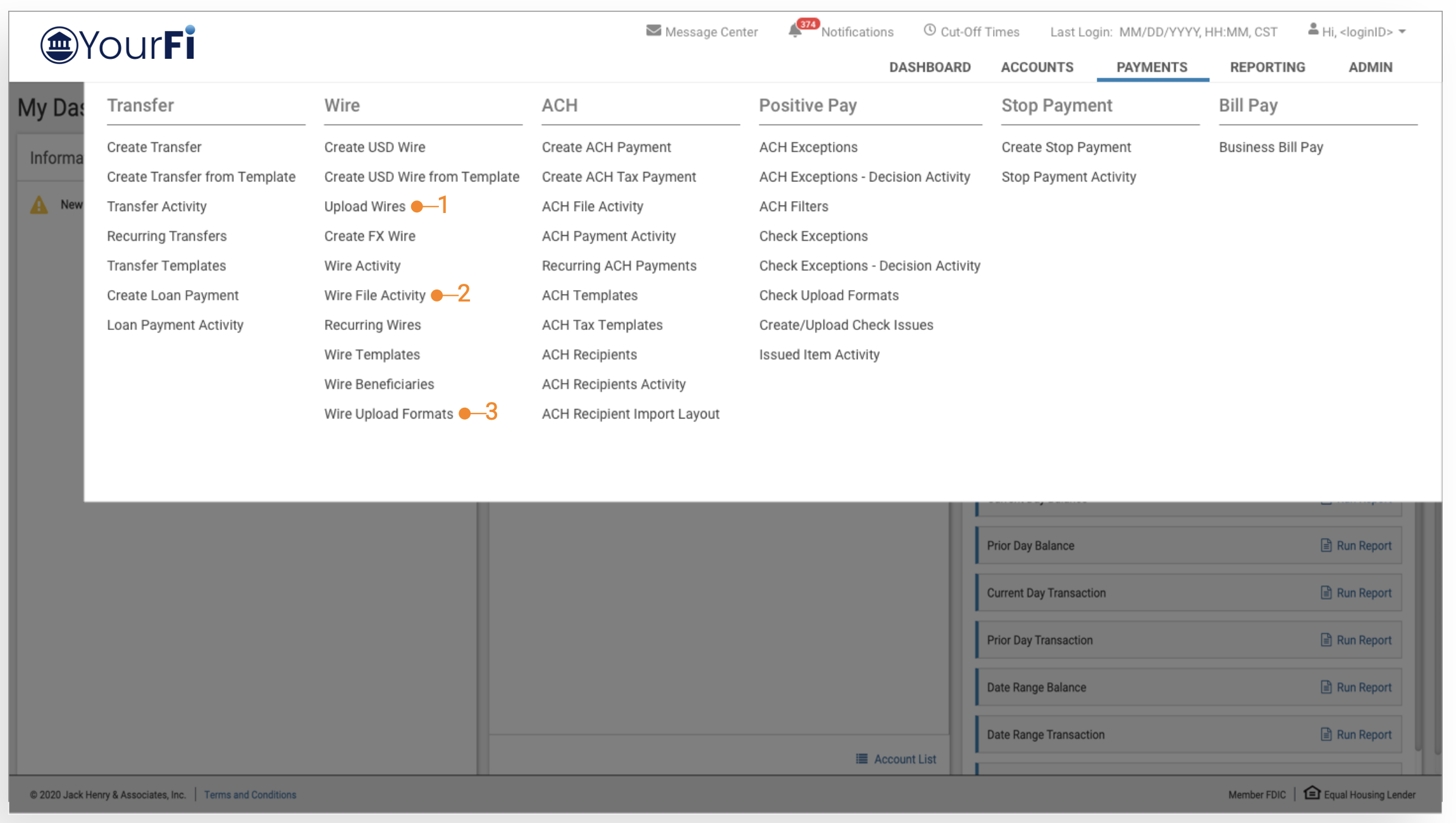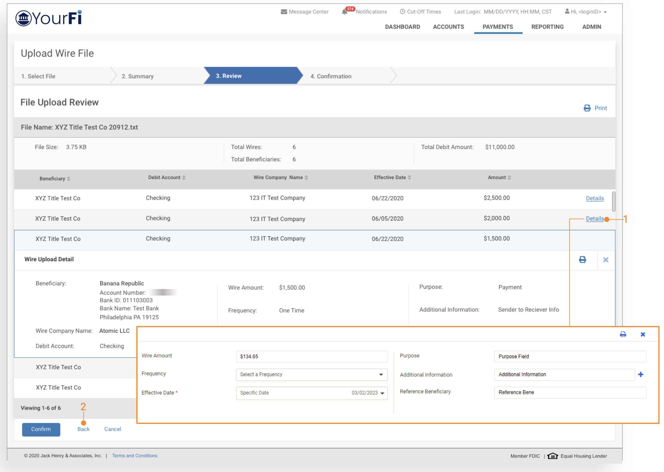 - Back Office Report providing visibility into the wire file activity.