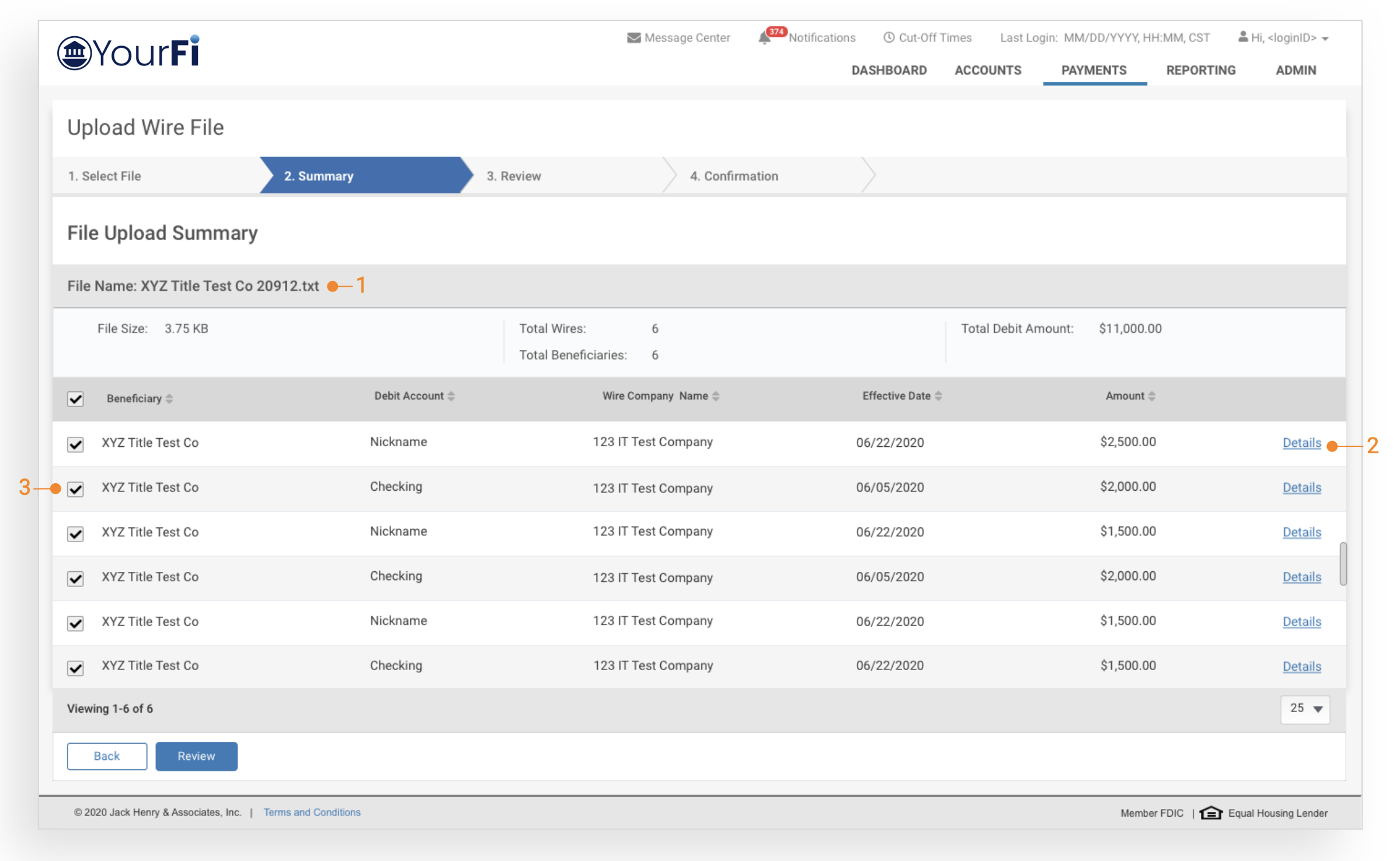 After a file has been uploaded, users can view a summary of file information including the file name, summary information (File Size, Total Wires and Beneficiaries, and Total Debit Amount), and a list of wires included in the file.