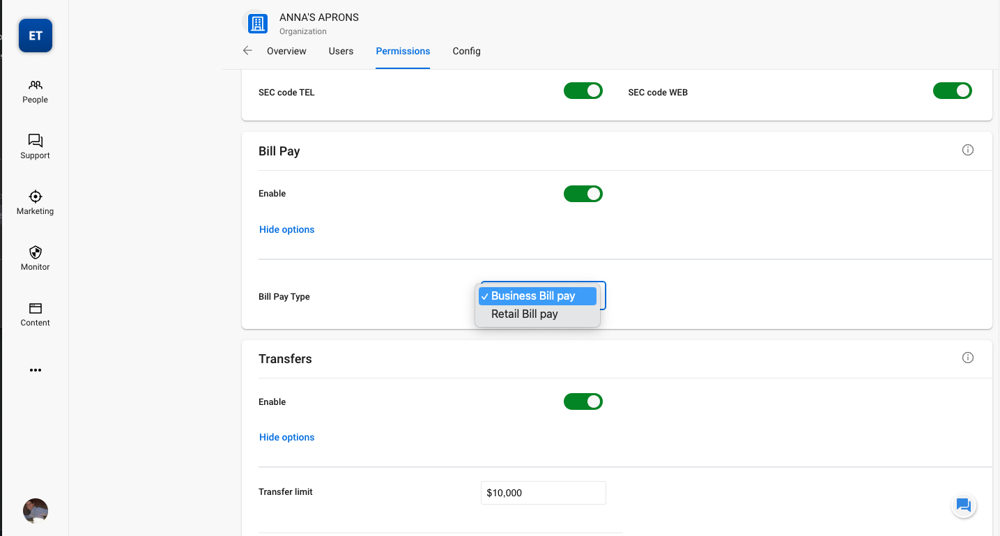 Step 2) Enable and enroll the Admin of the organization with the Bill Pay ability