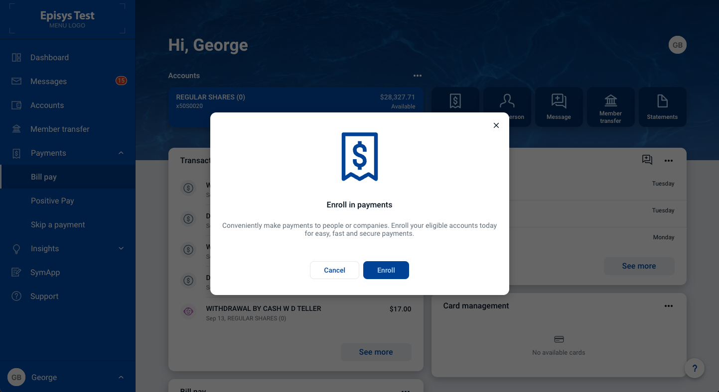 Enrolling is simple. When an end user navigates to the Payments page with no enrolled bill pay accounts, they are presented with a screen prompting them to click the Enroll button. After the request processes, the end user sees a success screen and a prompt to Add a payee.