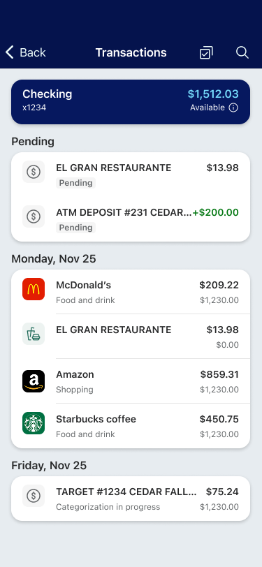 Native Banno Enrichments bring a modern and user-friendly transaction experience to the main transactions page, right where users expect it! Leveraging Bud Financial’s enrichment engine, Banno can enrich your retail accountholders’ transactions and display the enriched data directly within their Banno Apps UI. Transactions enriched by Bud through Banno identifiy a merchant, adding that merchant’s name to the transaction description and displaying a logo, if available. If the merchant’s logo is unavailable, the icon will instead show the transaction category the transaction falls into. If a transaction cannot be enriched for any reason, the original memo is still displayed to the accountholder.