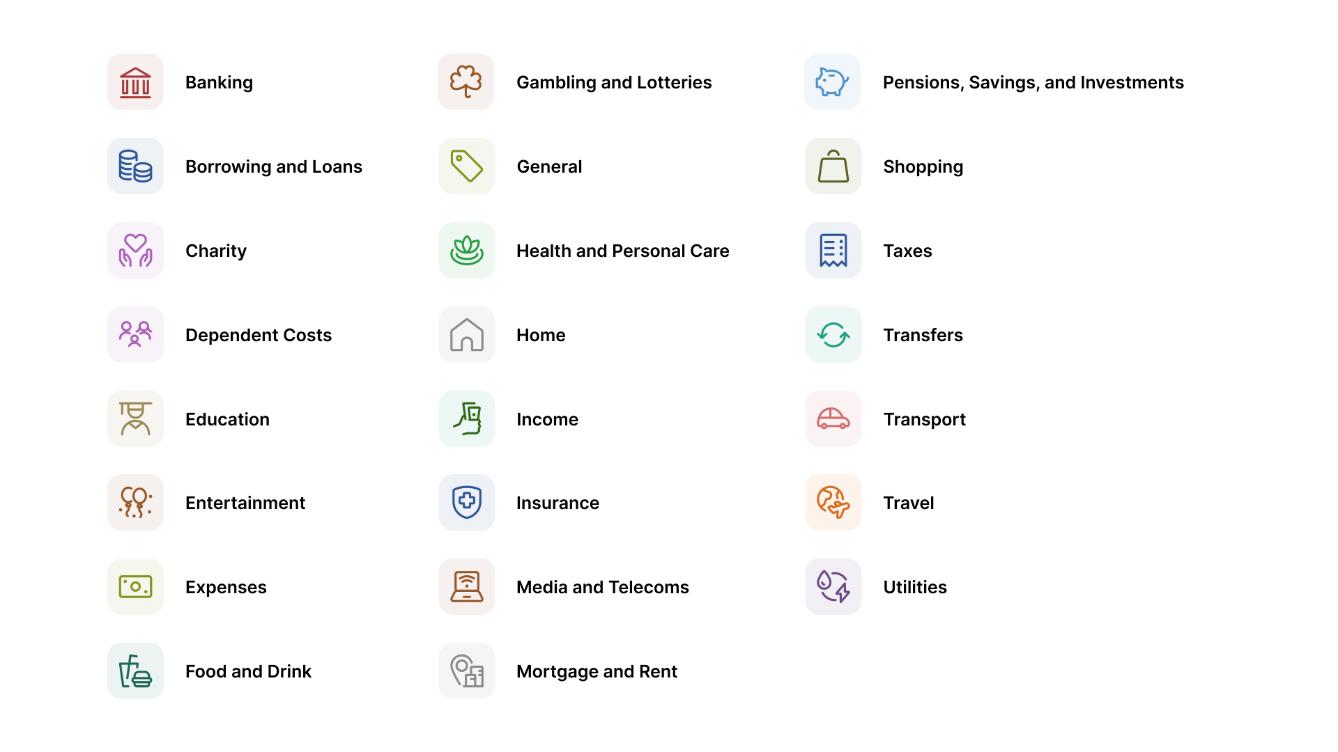 As the enrichment engine processes a transaction, it assigns the transaction one spending category from a list of predefined categories. Each category has specific icon associated with it that cannot be customized. The category icon also correspond with the spending wheel in the Spending by category dashboard card so the end user can review their spending habits.